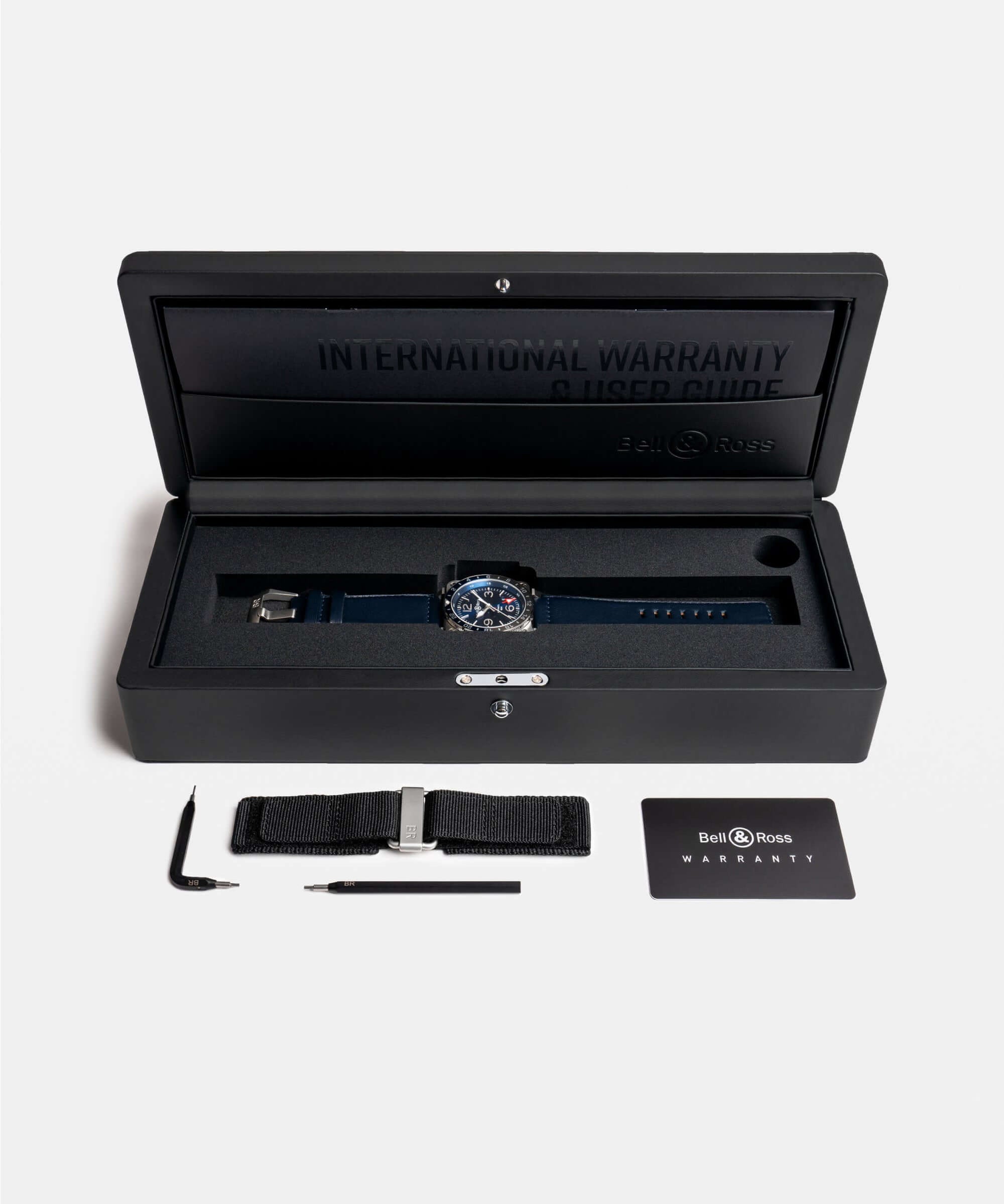 Strap | Blue coloured calfskin leather and ultra-resilient black synthetic fabric. |