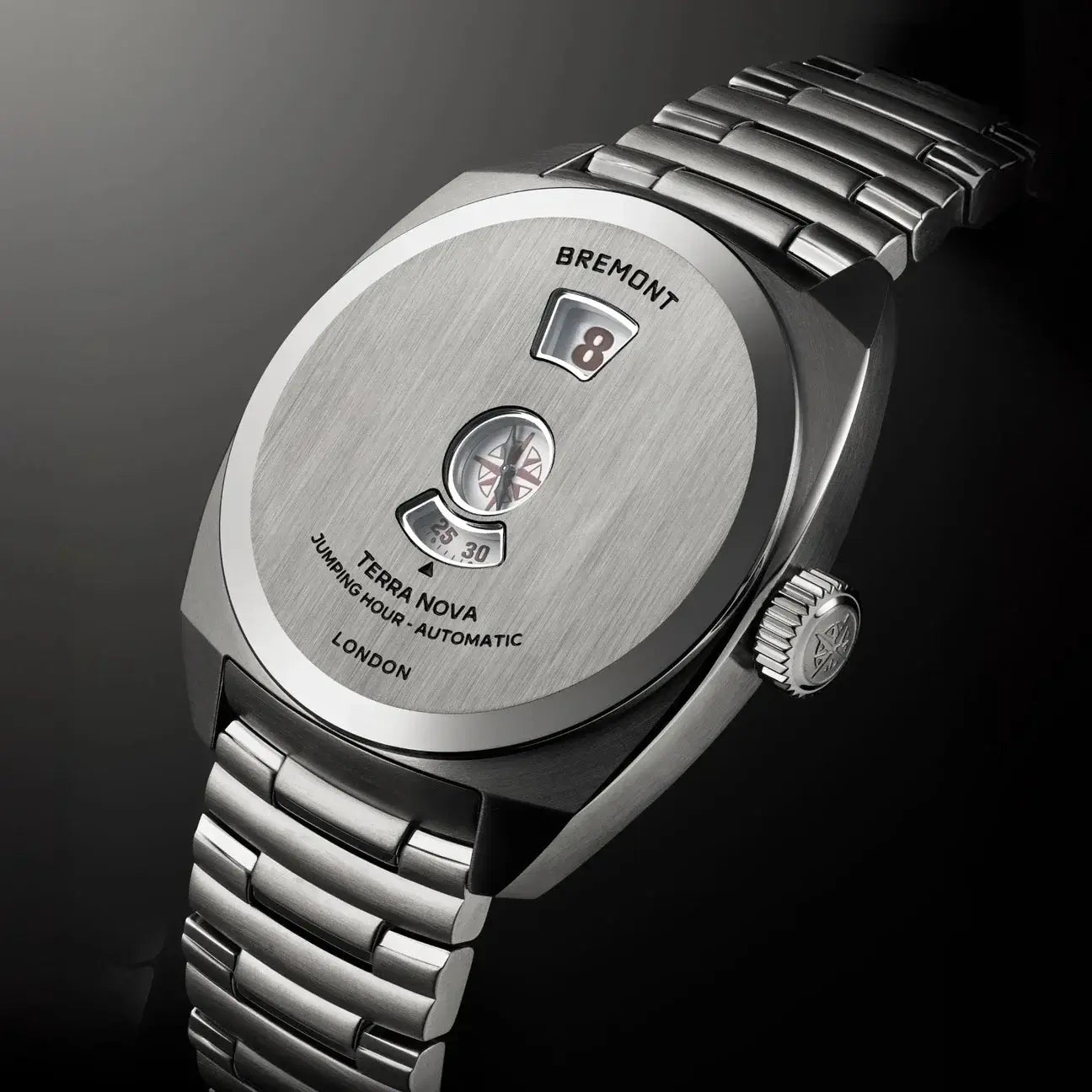 The latest Bremont Jumping Hour iteration continues the concept in 904L stainless steel. Its 38mm cushion-shaped case, meticulously finished in brushed and polished 904L steel, offers exceptional strength and corrosion resistance while retaining the rugged elegance that defines the Terra Nova collection of field watches.