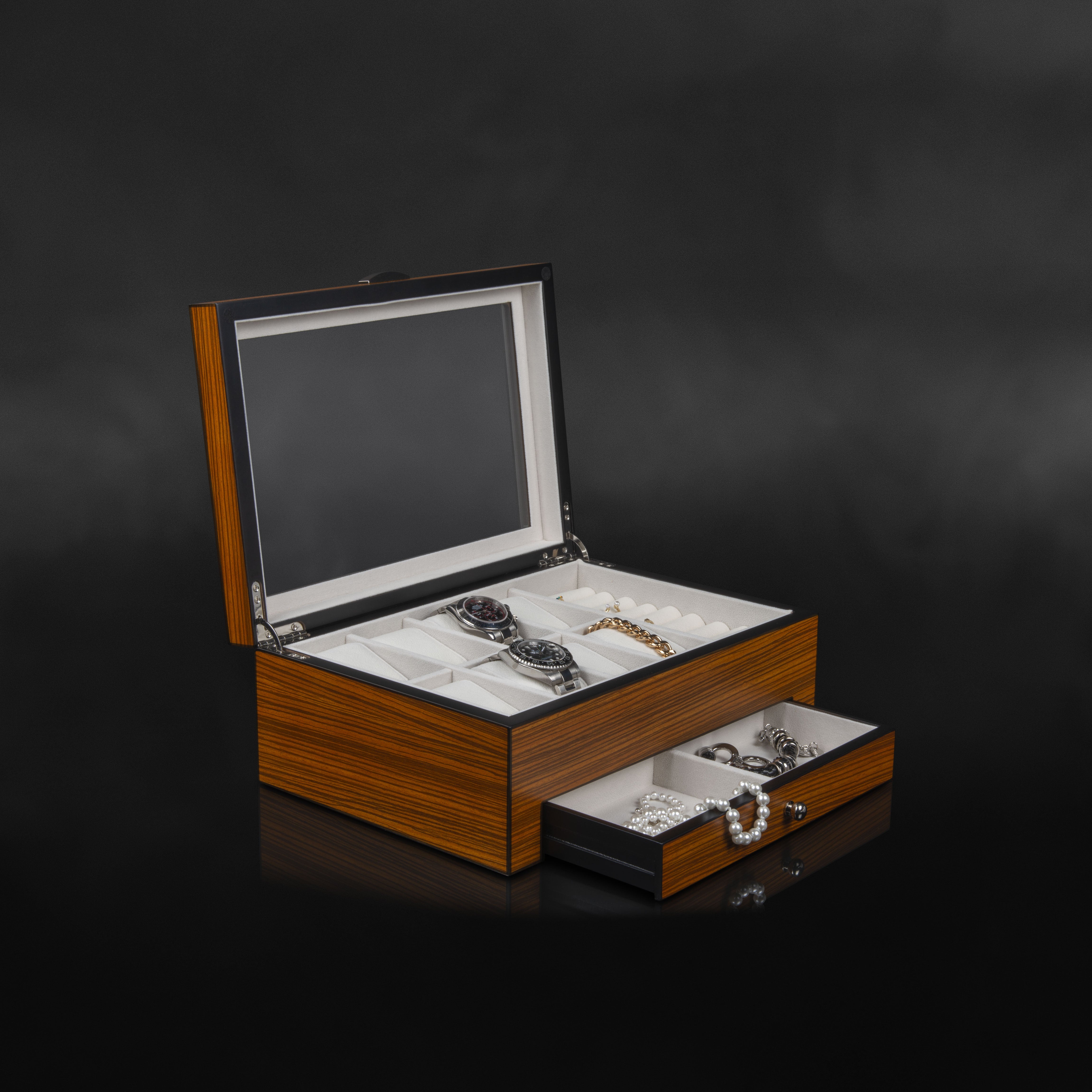 The Princeton watch and jewelry box combines classic elegance with practical functionality and offers a stylish solution for storing your most valuable accessories. The bright interior, lovingly lined with soft material, offers space for up to eight watches and additional compartments for rings and cufflinks. A glass pane protects the watches and jewelry while elegantly displaying them at the same time. There is a drawer in the lower section that is perfect for storing bracelets, necklaces and other valuables.