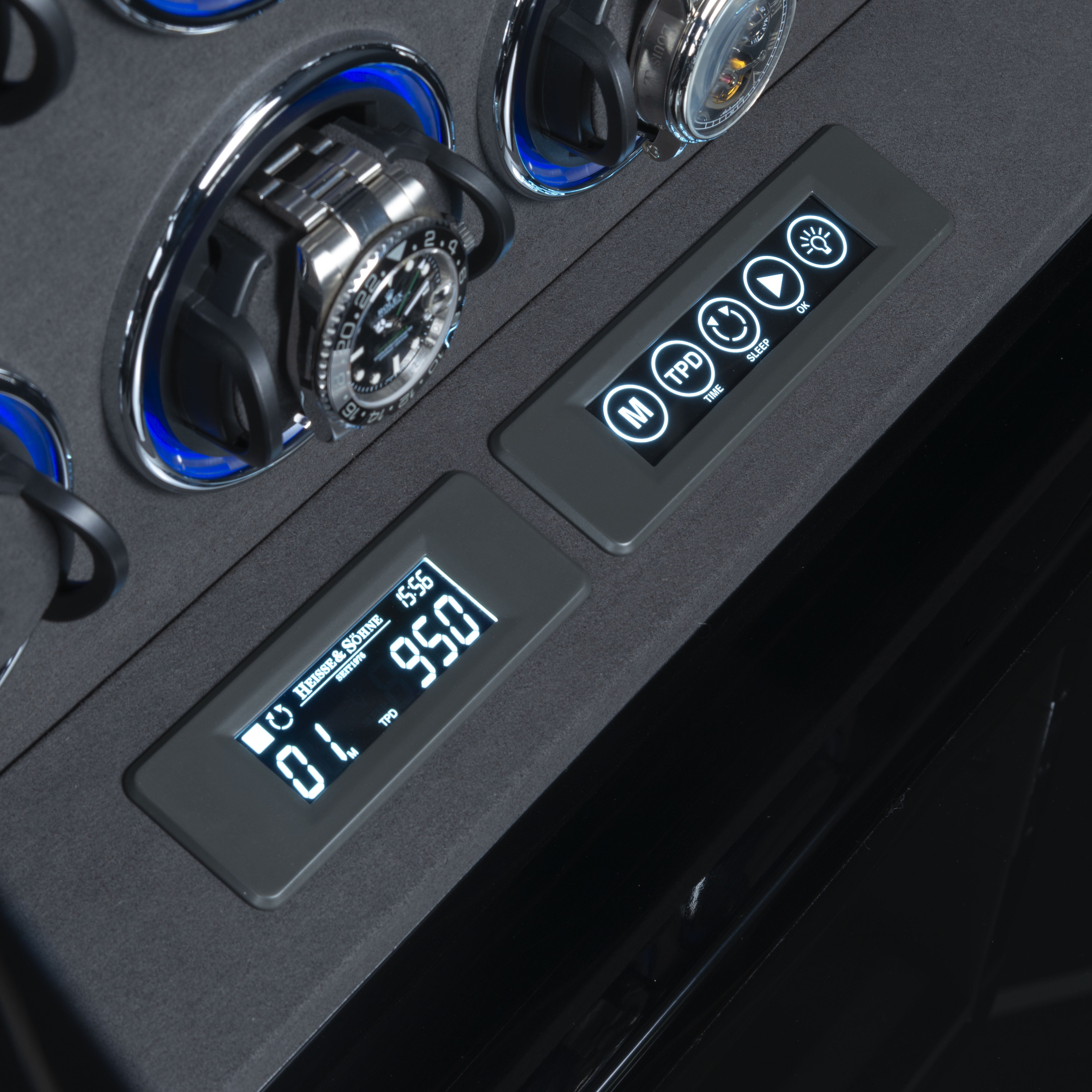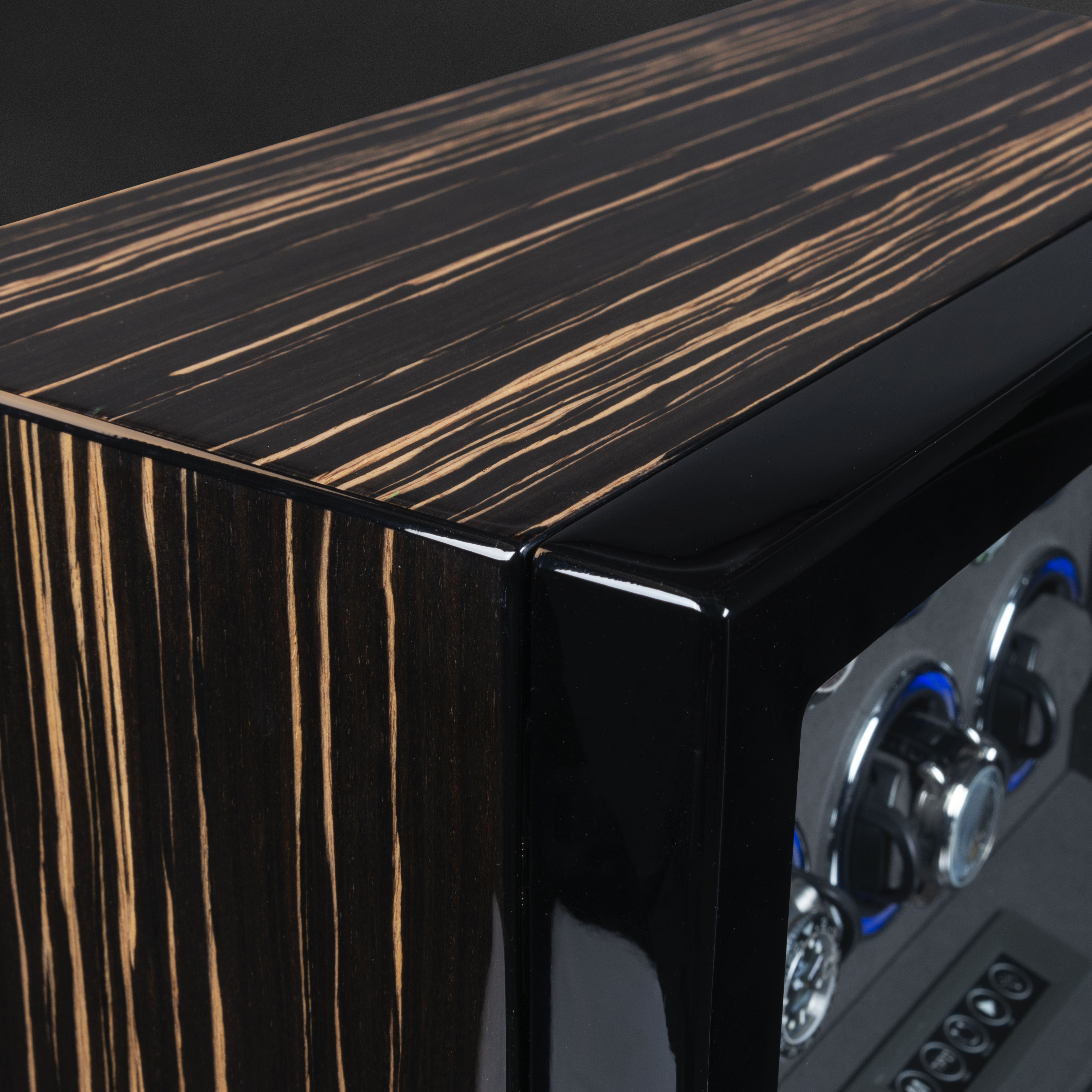 The Rome series watch winders combine luxury and technological innovation and set new standards in the presentation of automatic watches. With features such as the H&S Motion-Light, which creates fascinating light effects, and the electronic lock with H&S Fin-Protect technology for maximum security, they are impressive in terms of functionality and design. The surface in a sophisticated Ebony finish combines black and brown for an elegant look, while a chrome-plated element between the base and housing lends an elegant lightness. The Rome series is ideal for watch lovers who appreciate aesthetics, safety and perfection.