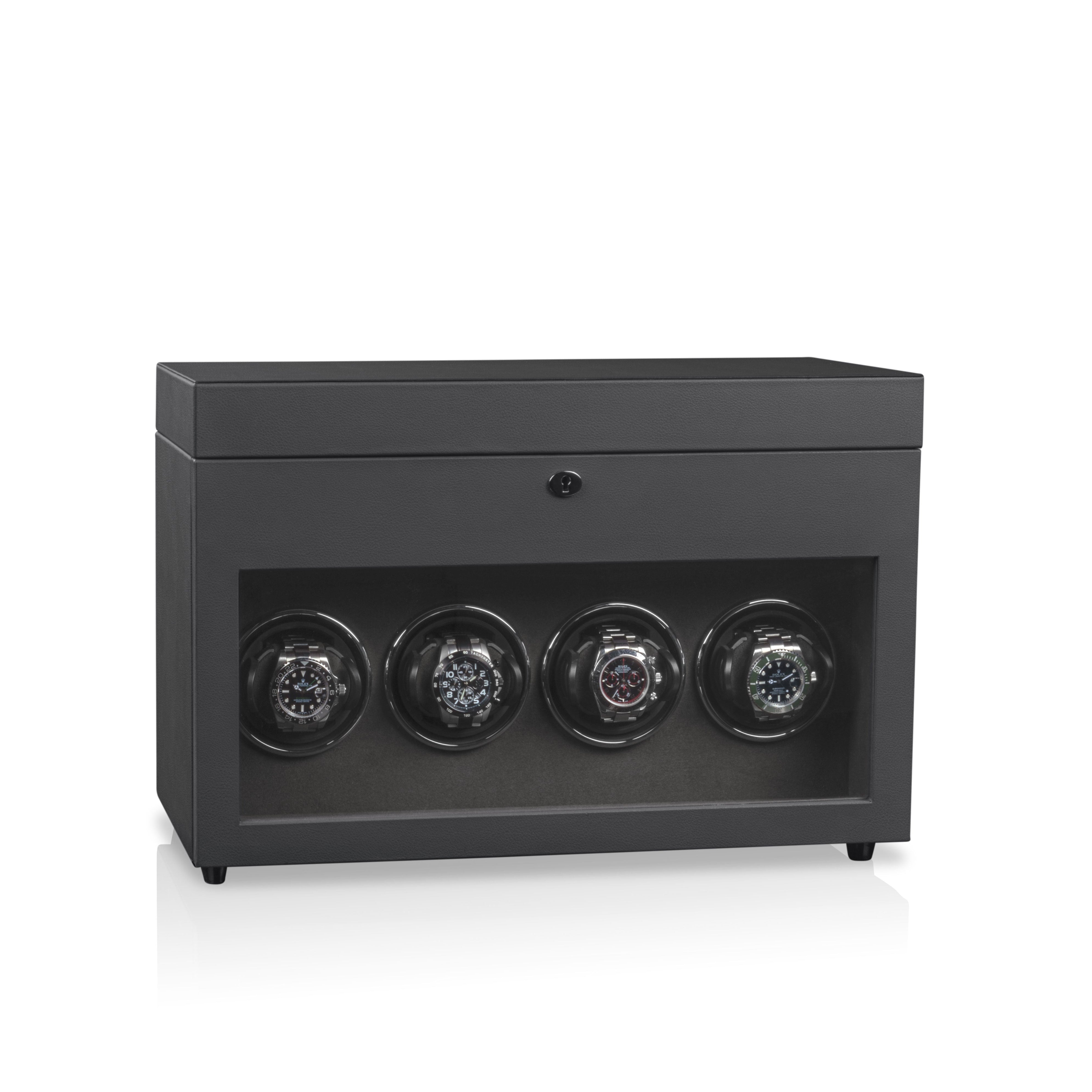 The design of the Vancouver series is both straightforward and functional. Depending on the selected version, up to eight automatic watches are gently rotated behind a lockable front. The additional shelf in the upper section of the watch winder allows you to store up to six additional watches. The soft watch cushions in the top compartment are fitted with chrome-plated guide pins on both sides to prevent the watches or watch cushions from slipping.