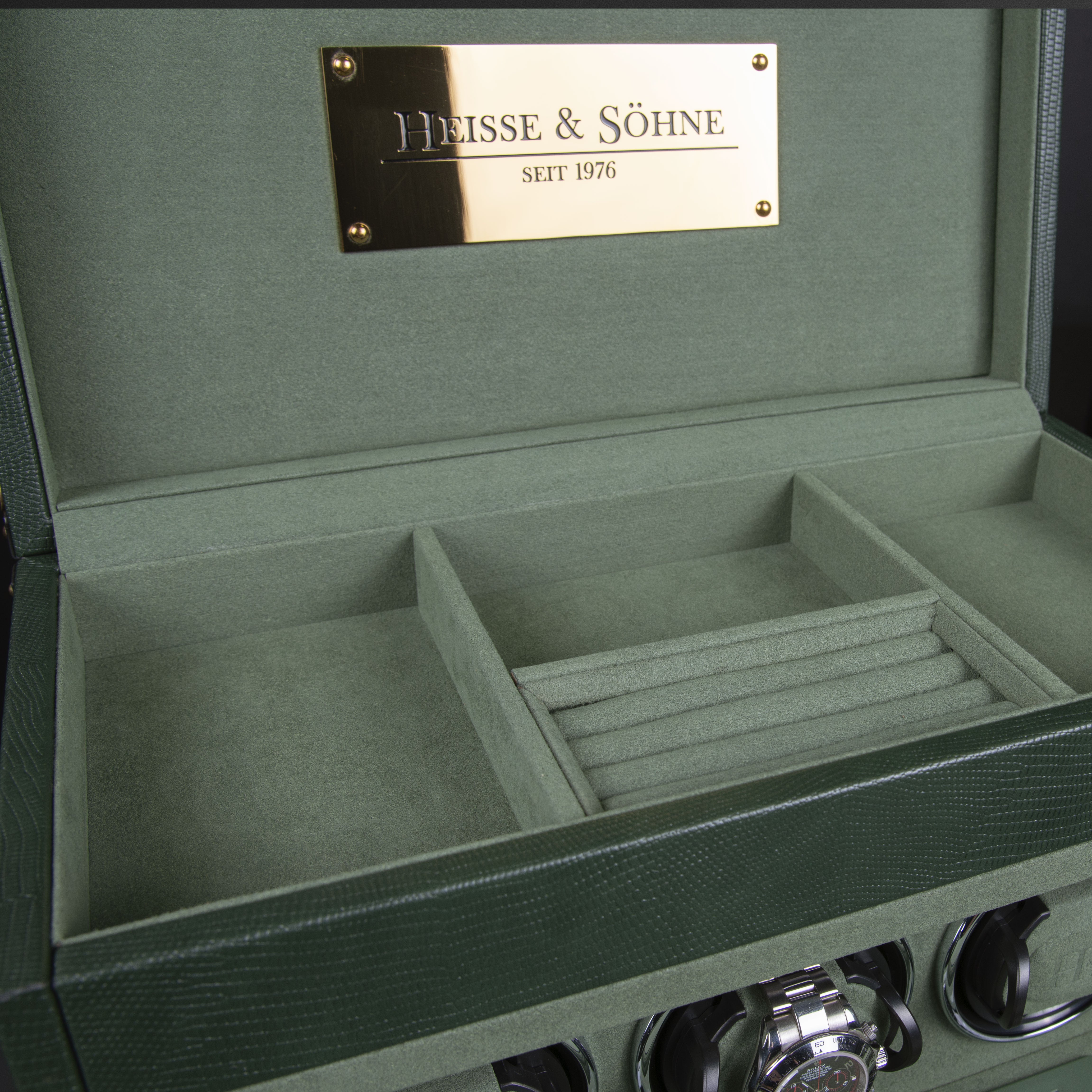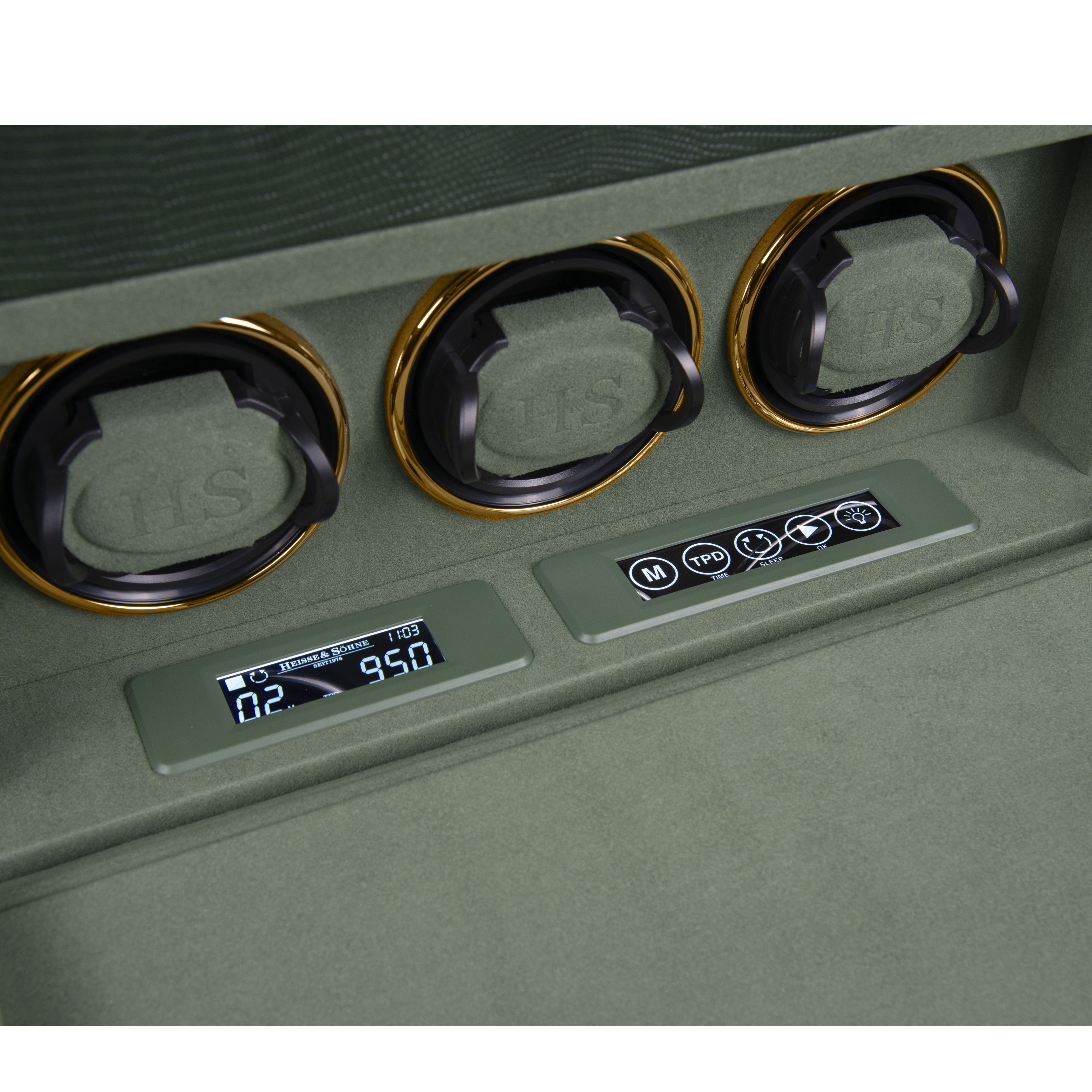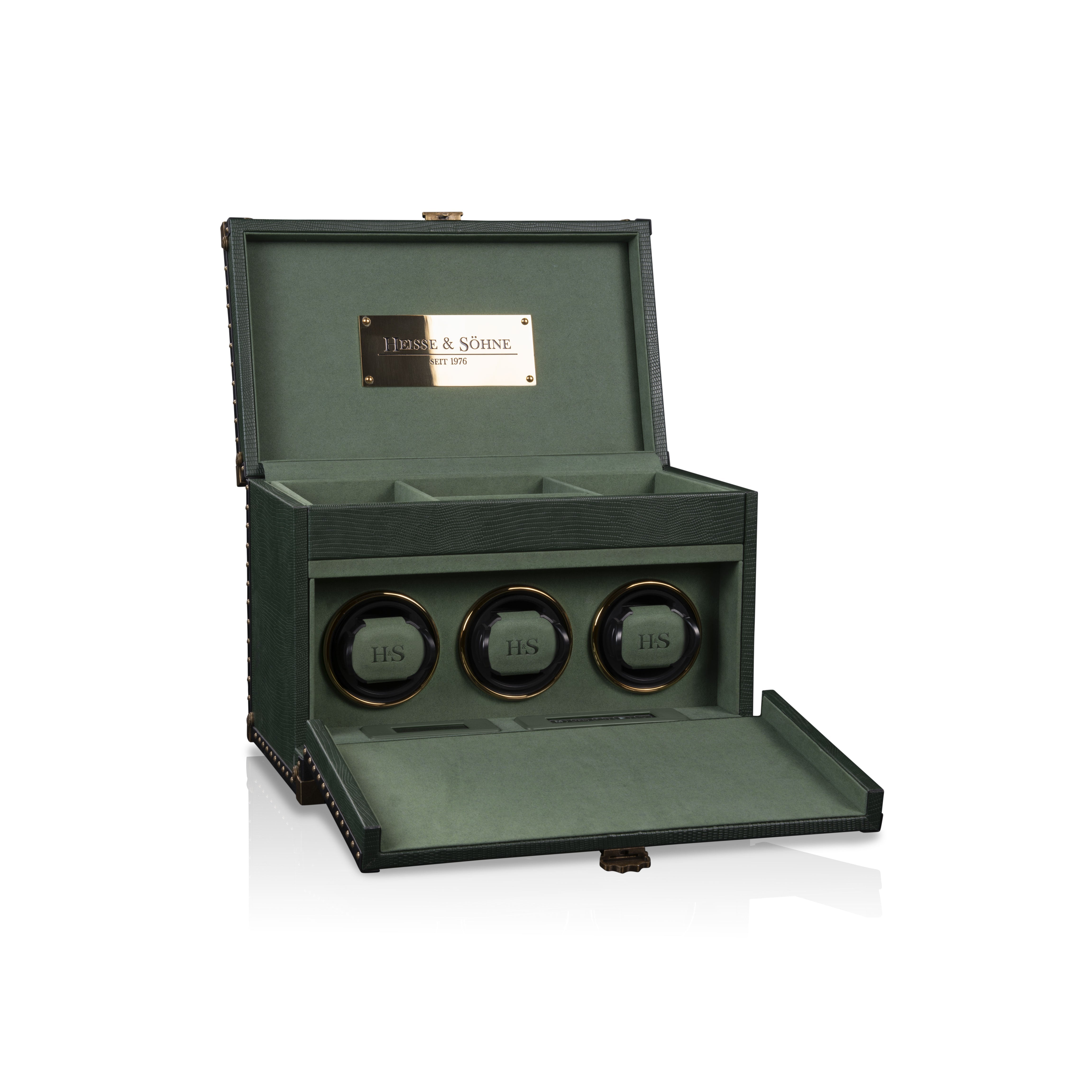 The Verne series, inspired by Victorian style and Steampunk design, combines luxurious aesthetics with advanced technology. The solid case, covered with vegan imitation leather and decorated by hand with rivets, offers space for three automatic watches. Additional jewelry and valuables can be stylishly stored in the top shelf. With technologies such as Premium-Drive, LCD-Control, Smart-Sleep and Interior-Light, the series guarantees a quiet and gentle winding as well as a perfect presentation.