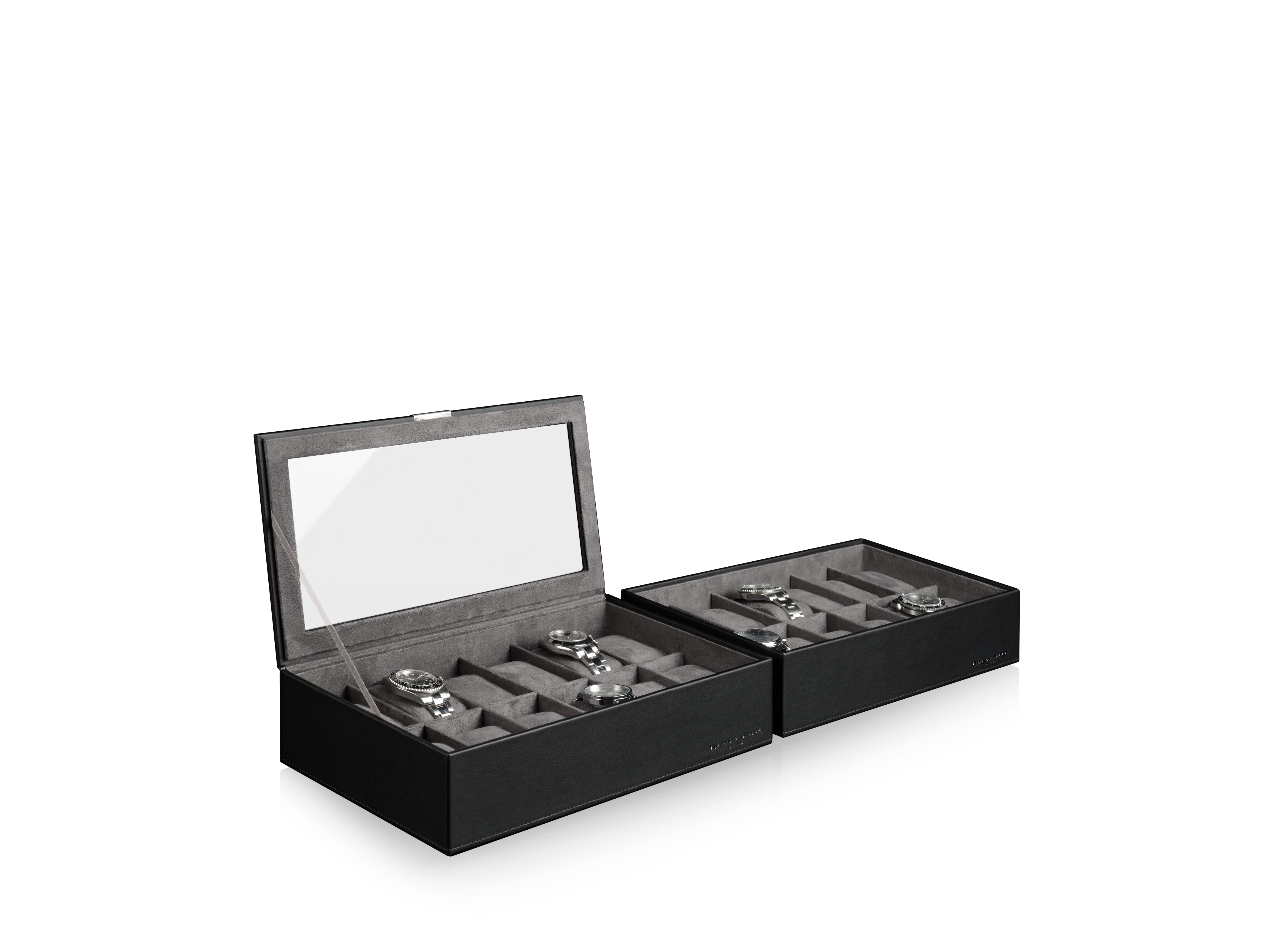 The storage options are as versatile as jewelry itself. For a long time it was nearly impossible to find the perfect storage for necklaces, bracelets, rings, pens, sunglasses, etc. With the modular jewelry and watch boxes of the Mirage series, you can individually combine different layers of jewelry that can be stacked on top of each other. Combine different layers and colors to create your individual jewelry box. The combination of robust, high-quality artificial leather on the outside and soft velour on the inside is noble and protects values permanently.