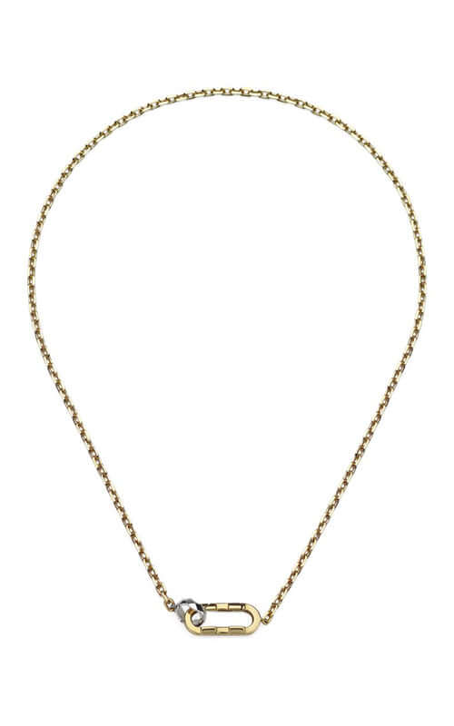 A new closure consisting of a rectangular link interlocked with a small hoop appears as part of the Gucci Link to Love line. Featuring as a central element in necklaces, earrings and bracelets, the modern design element reinforces the concept of togetherness. Here, the detail defines a chain necklace as part of the closure in precious yellow and white gold.