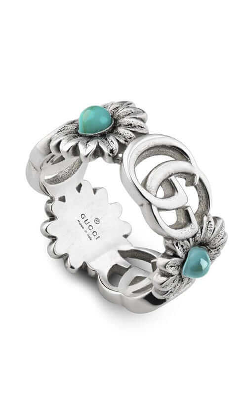 Gucci Marmont Silver Ring (YBC527394001014). Ring with double G and flower details in sterling silver, mother of pearl, topaz and turquoise resin