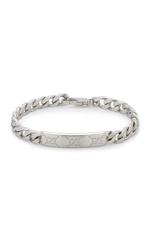 The GG motif returns on a selection of everyday pieces with a contemporary feel and easy-to-wear attitude. The engraved logo and dots design decorates the shiny sterling silver base, covered with a coating technique to reduce oxidation. Here it appears as tag charm as part of a chain bracelet.