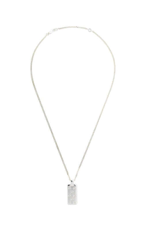The GG motif returns on a selection of everyday pieces with a contemporary feel and easy-to-wear attitude. The engraved logo and dots design decorates the shiny sterling silver base, covered with a coating technique to reduce oxidation. Here it appears as tag pendant as part of a chain necklace.