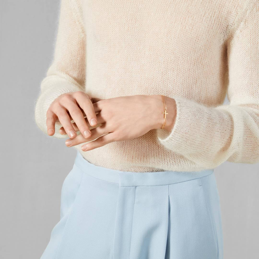 The Link to Love collection spotlights its namesake feature in imaginative designs. This season, the cross, characterized by multiple facets, forms the 'link' in an innovative double chain design. Here, the symbol defines this bracelet, crafted from 18k yellow gold.