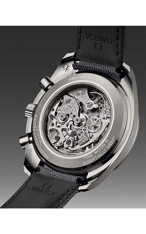 The specially decorated movement is the OMEGA Co-Axial Master Chronometer Calibre 3869, while the engravings on the caseback include the quote, THE MOON IS ESSENTIALLY GREY, which is attributed to Command Module Pilot, Jim Lovell, during the Apollo 8 mission.