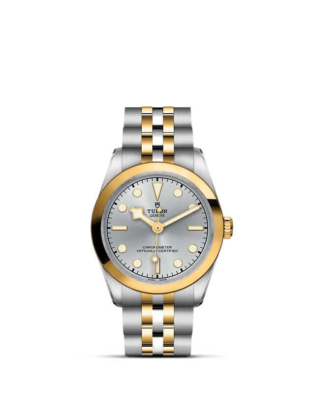Five year guarantee. 31 mm 316L steel case with polished and satin finish. Self-winding mechanical movement, Manufacture Calibre MT5201. Power reserve of approximately 50 hours. Yellow gold screw-down winding crown with the TUDOR rose in relief. Waterproof to 100 m (300 ft). Yellow gold bezel, silver dial with flat sapphire crystal. Steel and yellow gold bracelet, polished and satin finish, with steel “T-fit” folding clasp and safety catch.