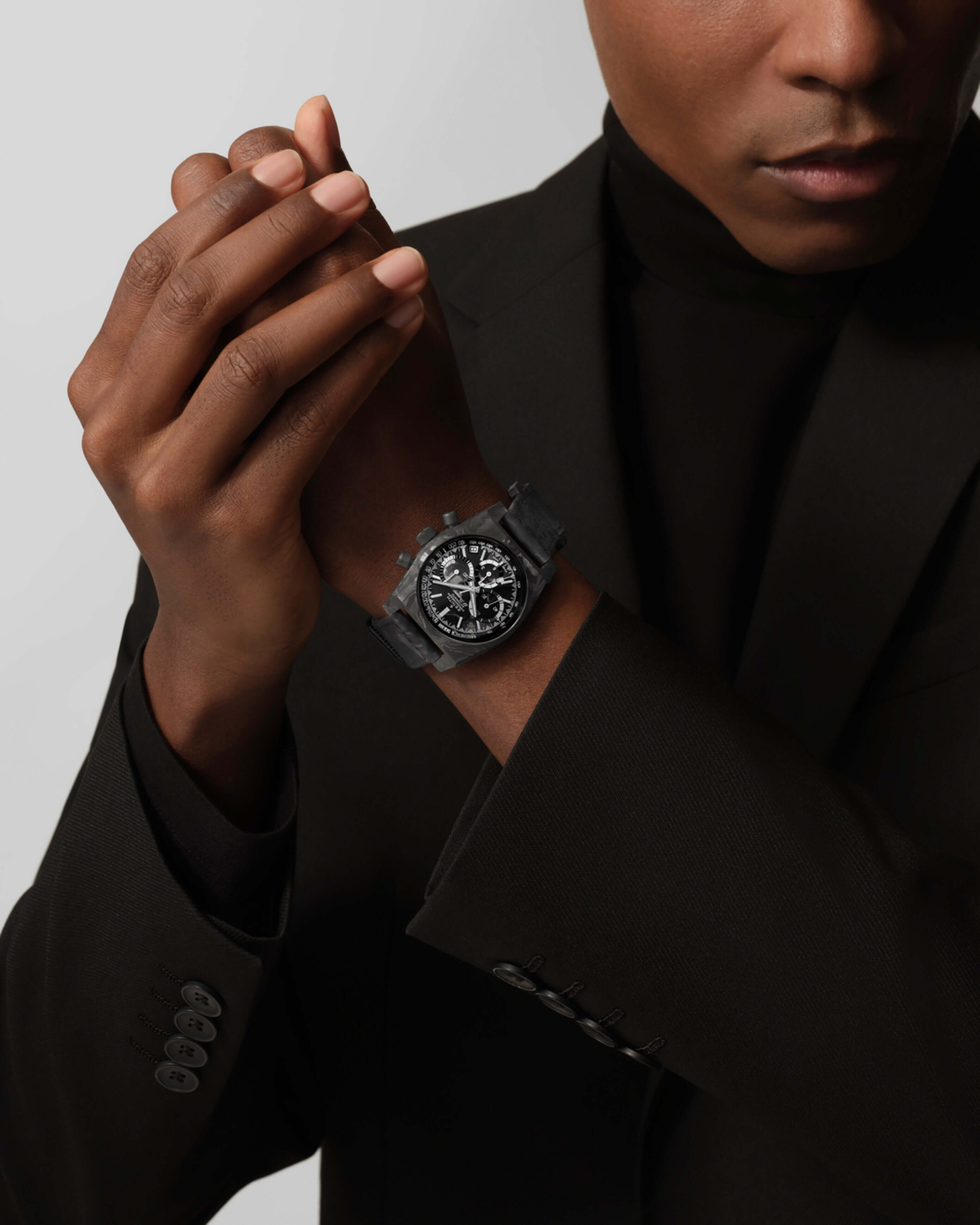The ZENITH CHRONOMASTER Revival Cover Girl Carbon is the third re-edition inspired by the A3818 and presented with Revolution. Lighter than ever, it features a high-tech carbon composite case. Its black carbon dial features luminescent faceted hour markers. Powered by the El Primero automatic high-frequency chronograph calibre. A limited edition of 150 pieces, delivered with both a black «carbon effect» Velcro Strap and a black embossed «ladder effect» calfskin strap.