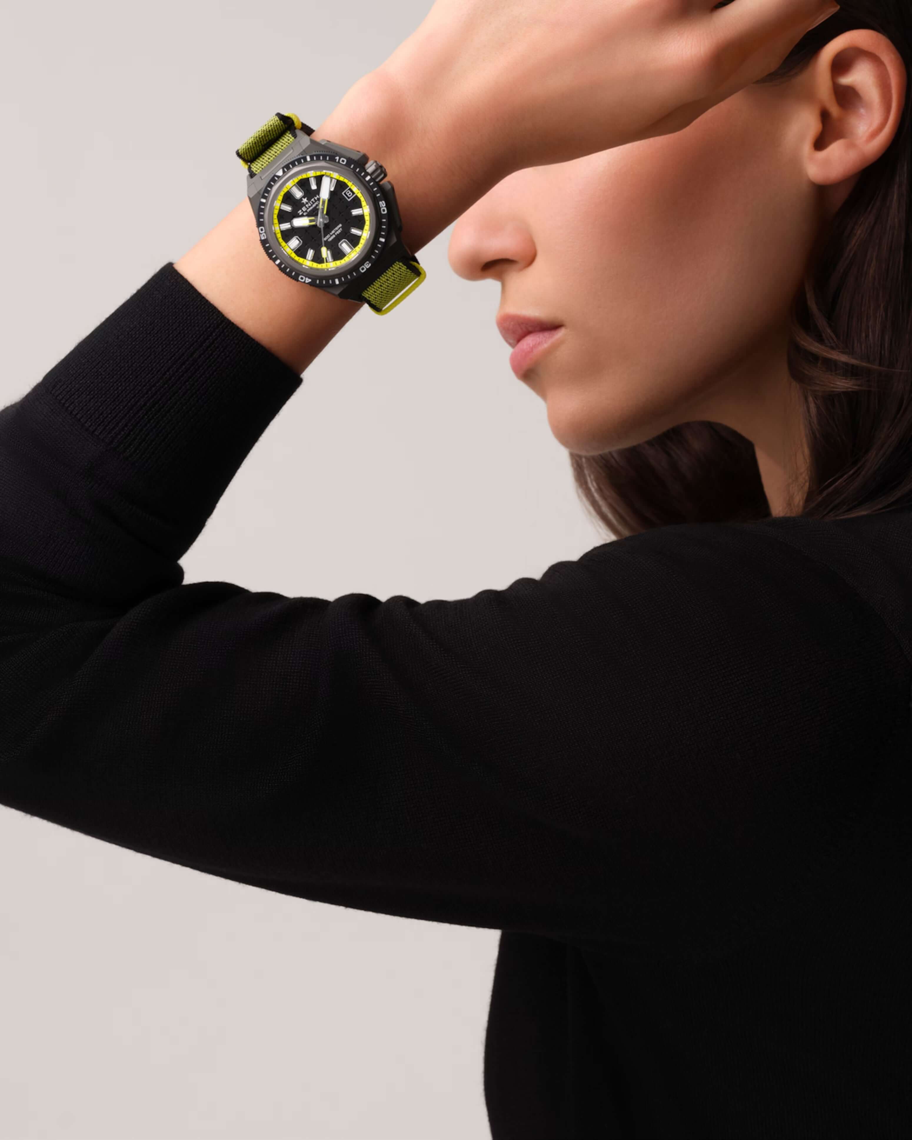 The DEFY Extreme Diver comes in a 42.5mm angular case crafted in microblasted titanium. Equipped with a black ceramic rotating bezel and helium escape valve, with a water-resistance of 60 ATM (600 metres). Featuring a black and yellow star-patterned dial with luminescent markers and hands. Powered by the El Primero 3620 automatic movement with 60 hours power reserve. Delivered with a microblasted titanium bracelet, a black “cordura effect” rubber strap and a black and yellow single-piece fabric strap that can easily be swapped thanks to our clever strap changing system.