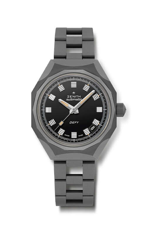 A modern reinterpretation of the first DEFY wristwatch model from 1969. Crafted in a robust octagonal matte finished titanium case with 14-sided bezel and paired with a titanium ladder bracelet. The matte black dial adds a distinctly vintage touch.