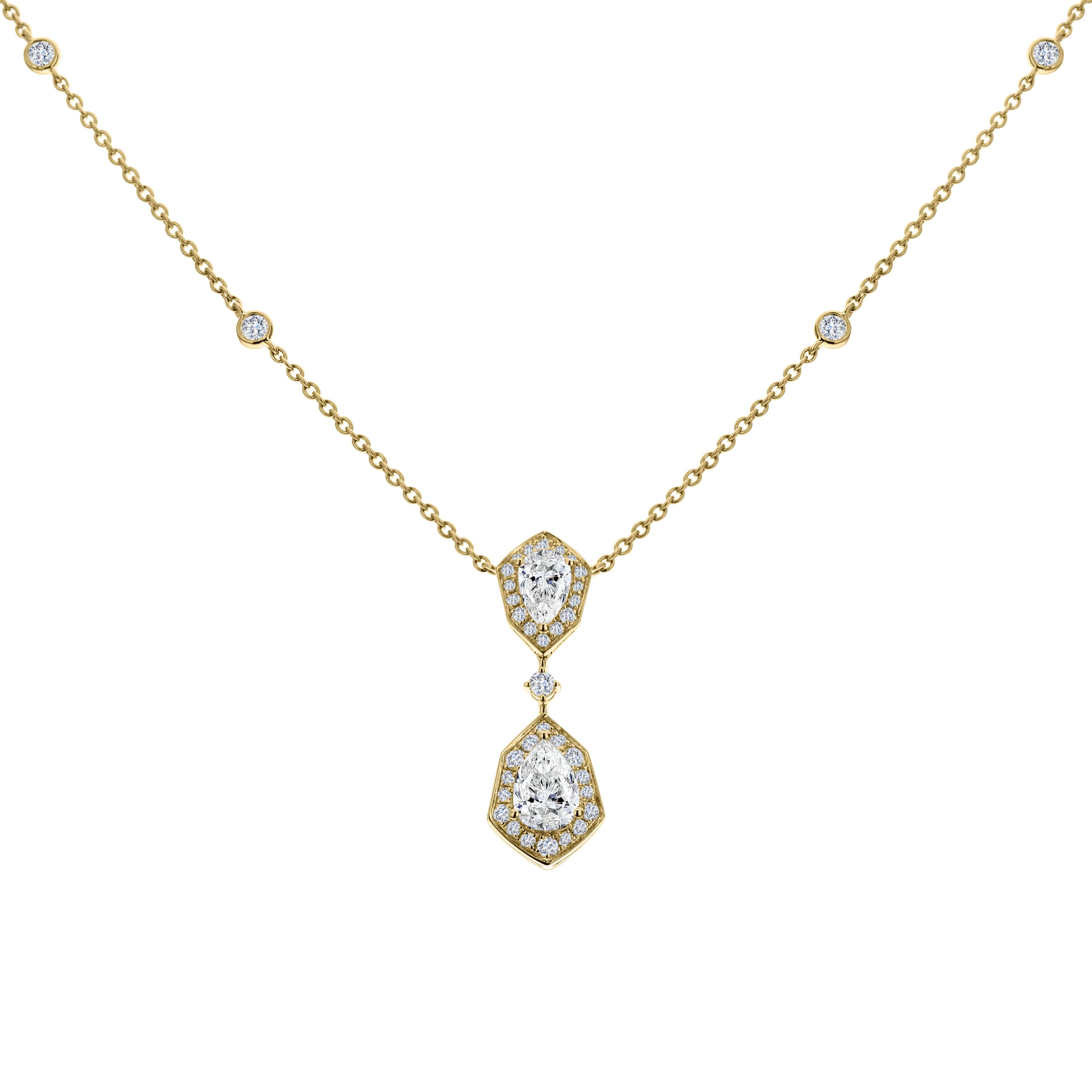 Bandiera Jewellers Diamond Necklace 1.61ct. 18kt yellow gold necklace with 37 round diamonds, total of 0.45cts, one pear-shaped diamond 0.41ct and second pear-shaped diamond 0.75ct.