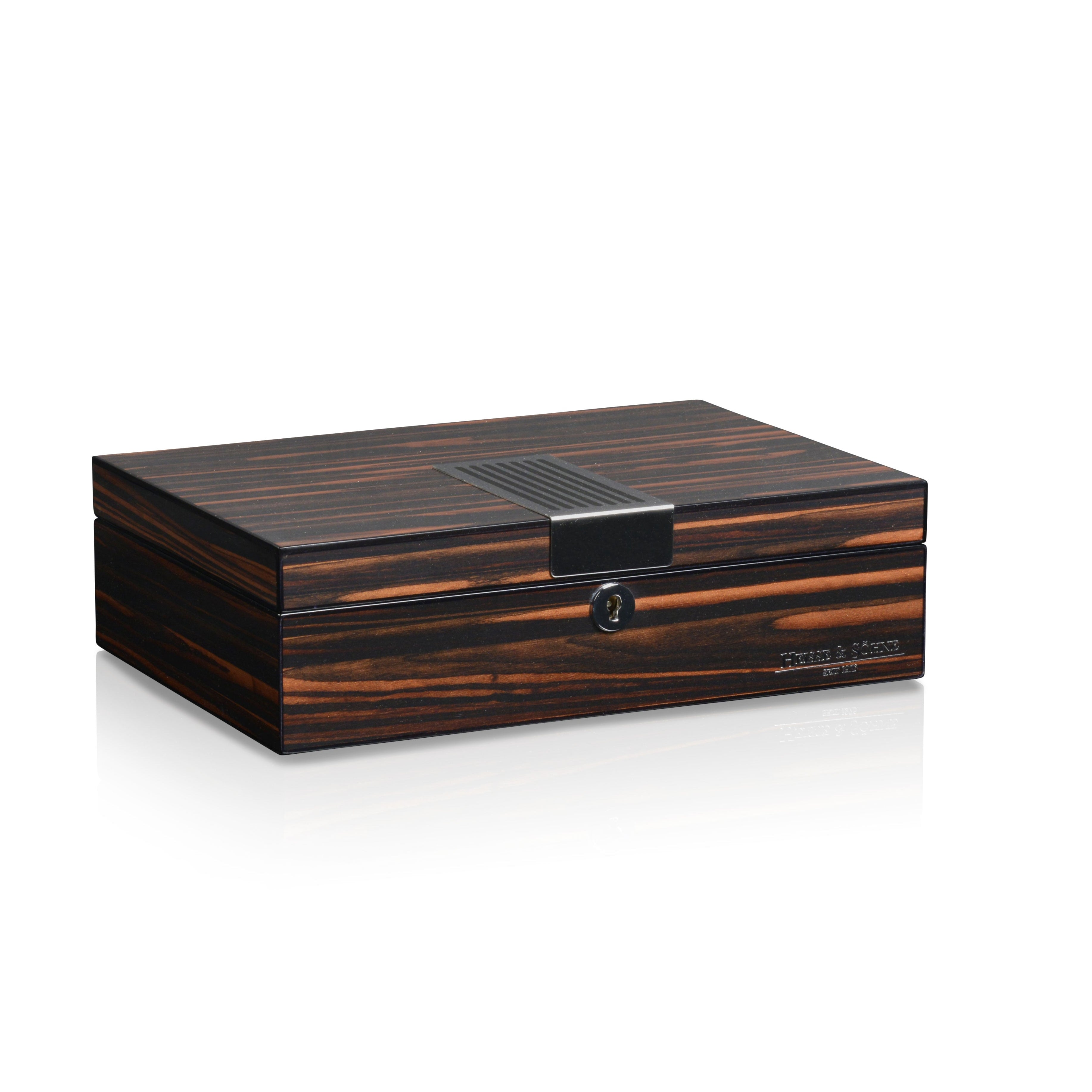 The elegant Berlin watch box is an exquisite choice for discerning watch lovers who value style and security. With space for eight watches, it not only offers functional benefits, but is also an optical highlight. The high-quality wooden housing in fascinating black and brown tones, combined with chrome-plated metal applications, lends the box a touch of exclusivity. The interior, lined with a soft fabric, protects the watches from scratches and damage. The generously dimensioned watch cushions, with a width of approx. 60 mm and a circumference of approx. 19 cm, offer perfect support for watches of all sizes – from petite to large timepieces.
