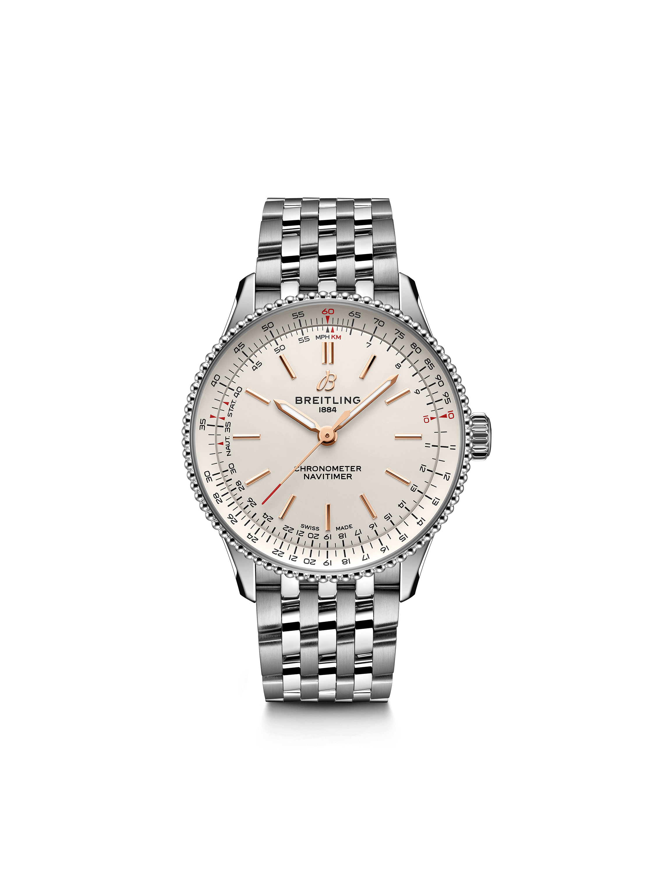 The 36-mm Navitimer features the beaded bezel and iconic circular slide rule (used by pilots as an analog calculator) that give the Navitimer its unmistakable appearance.