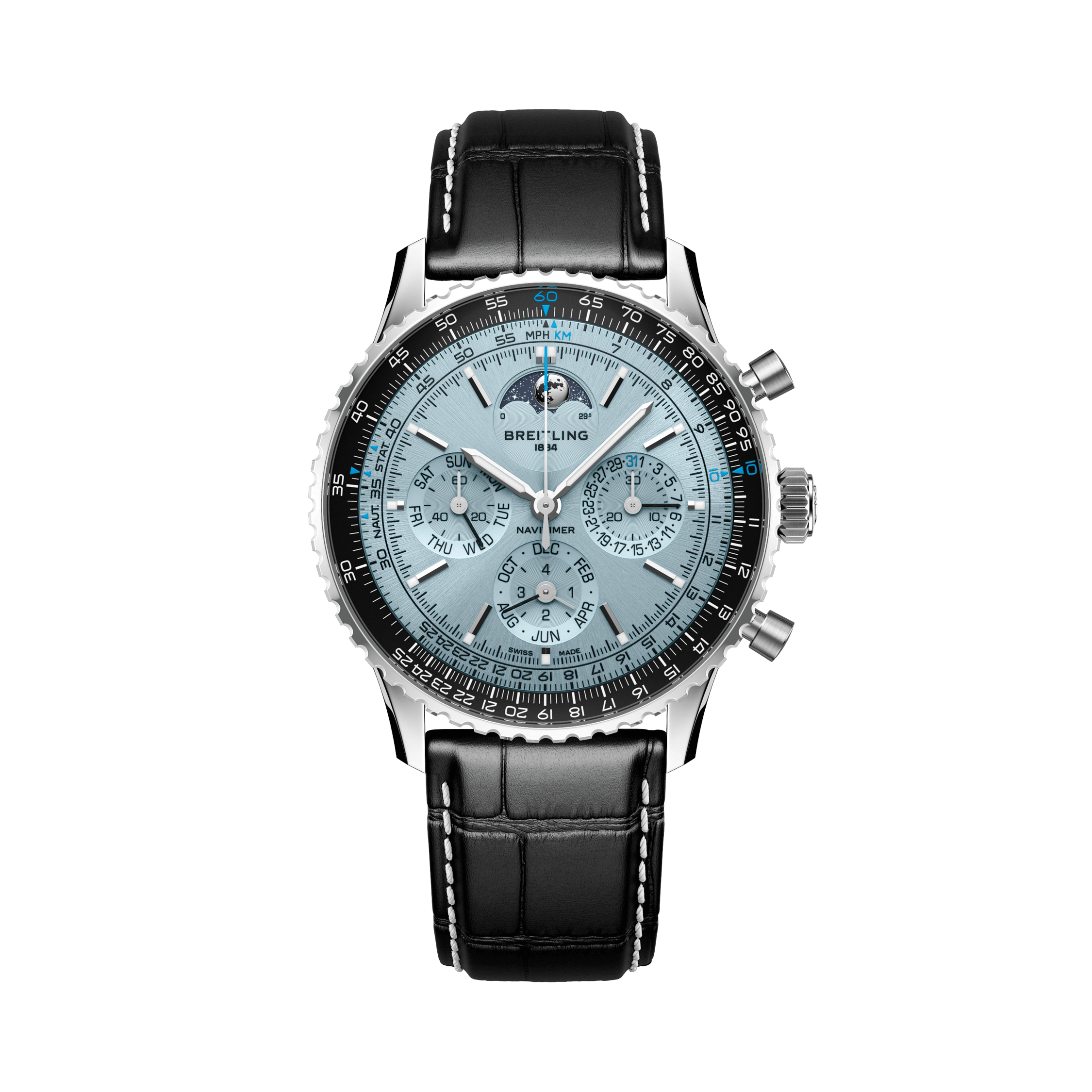 In 1962, it became the first Swiss wristwatch in space. This edition bridges past and future: a steel case, platinum bezel, ice-blue dial, and the remarkable B19 movement—an automatic chronograph with a perpetual calendar. A watch built from heritage, made for today.