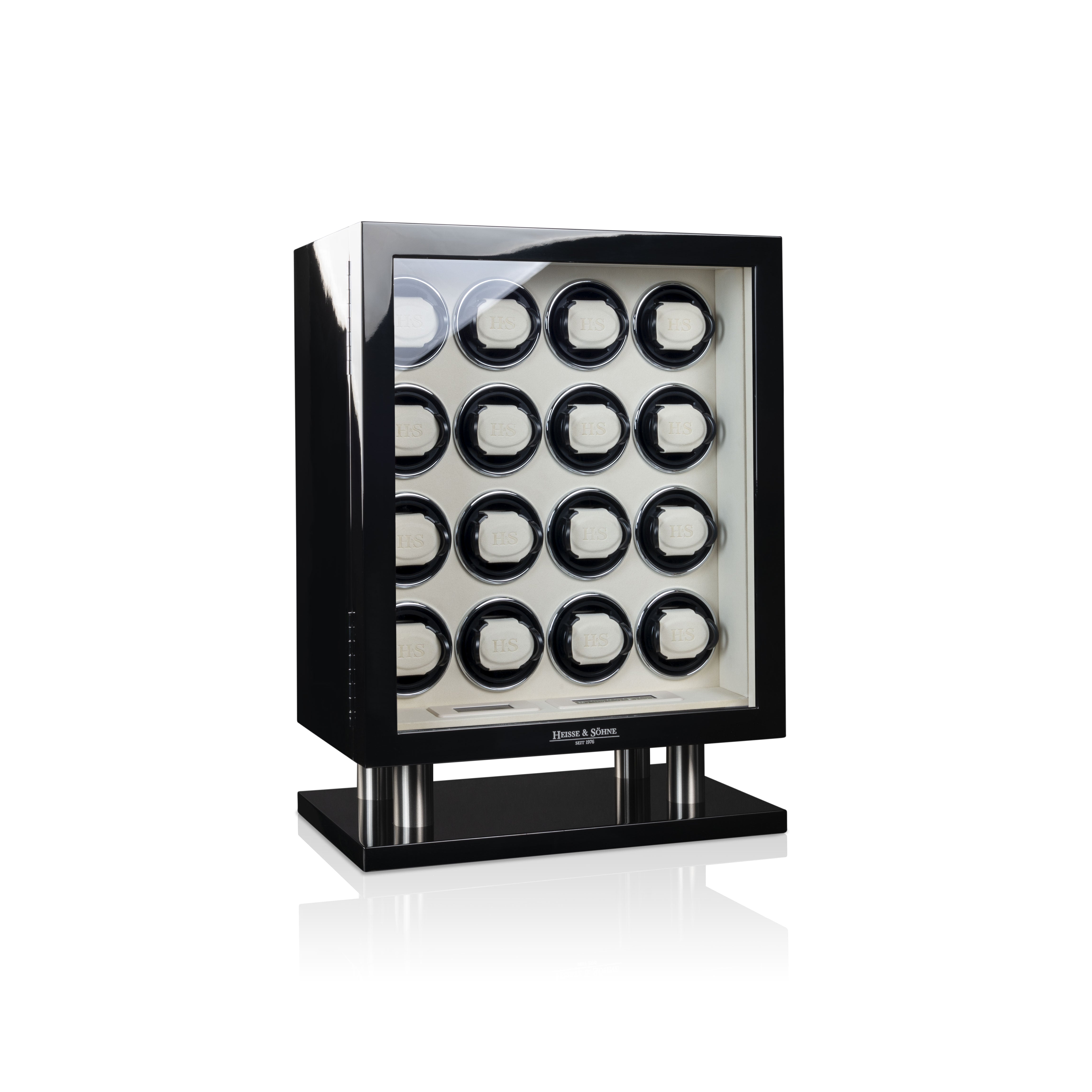 As your collection of fine automatic watches grows, the need for care, security and comfort in watch storage will grow as well. Whether as a stylish addition on a sideboard or an elegant eye-catcher on a pedestal, the collectors of the brand Heisse & Söhne cut a fine figure everywhere. The brushed and anodized aluminum applications in the base are highly expressive features of this series. The separately switchable interior lighting sets your watches perfectly in scene at any time of day or night. A lock protects the watches in the watch winder from unauthorized access.