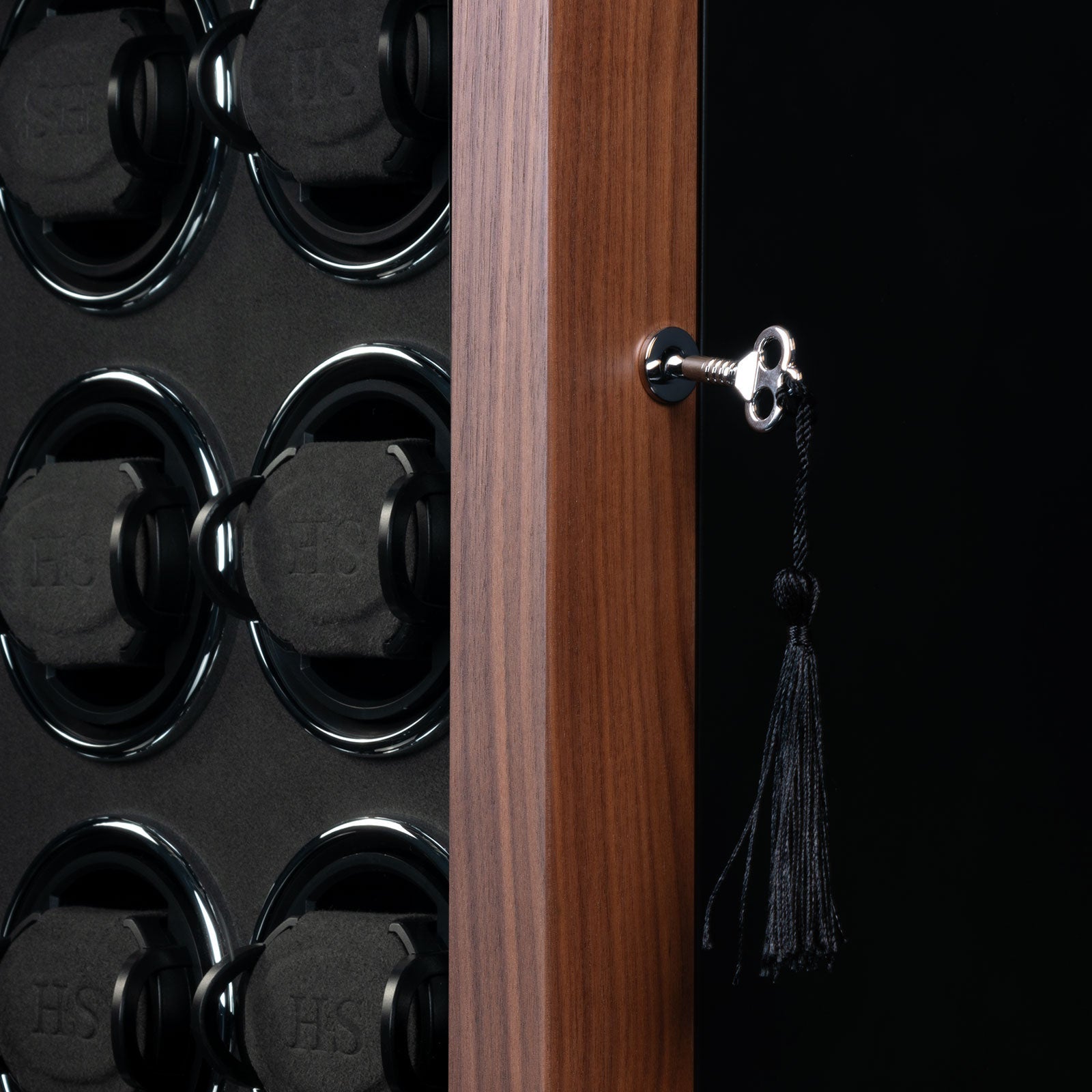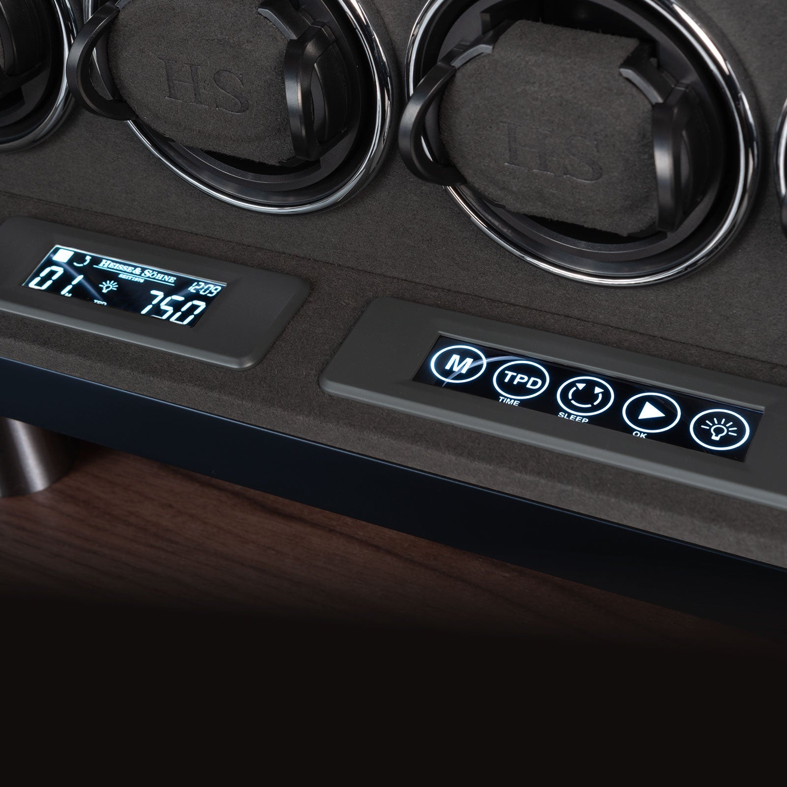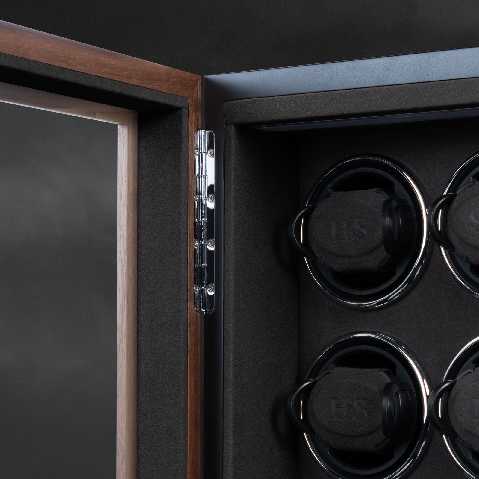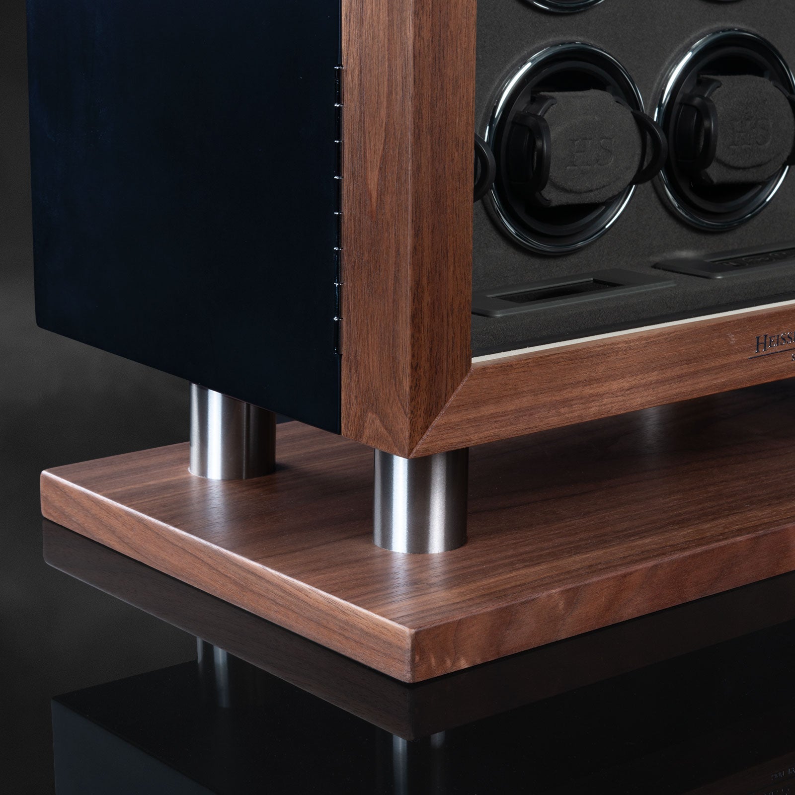 The ever-growing fascination with mechanical timepieces is leading to rapidly growing watch collections. The watch winders of the New York series are predestined for safe and stylish storage. The combination of American walnut and matte lacquer gives this series its simple elegance. The brushed and anodized aluminum applications in the base are highly expressive features of this series. The separately switchable interior lighting sets your watches perfectly in scene at any time of day or night. A lock protects the watches in the watch winder from unauthorized access.