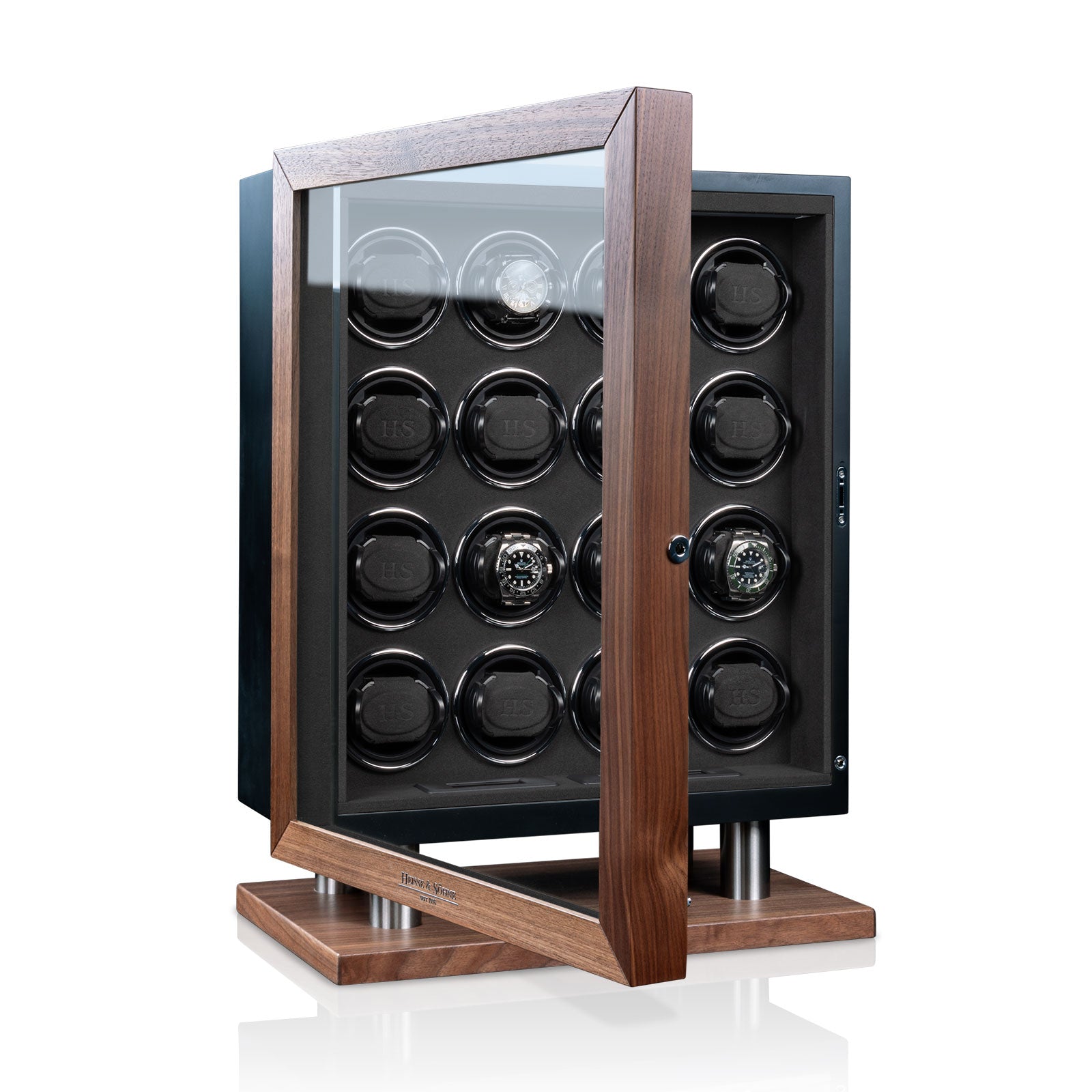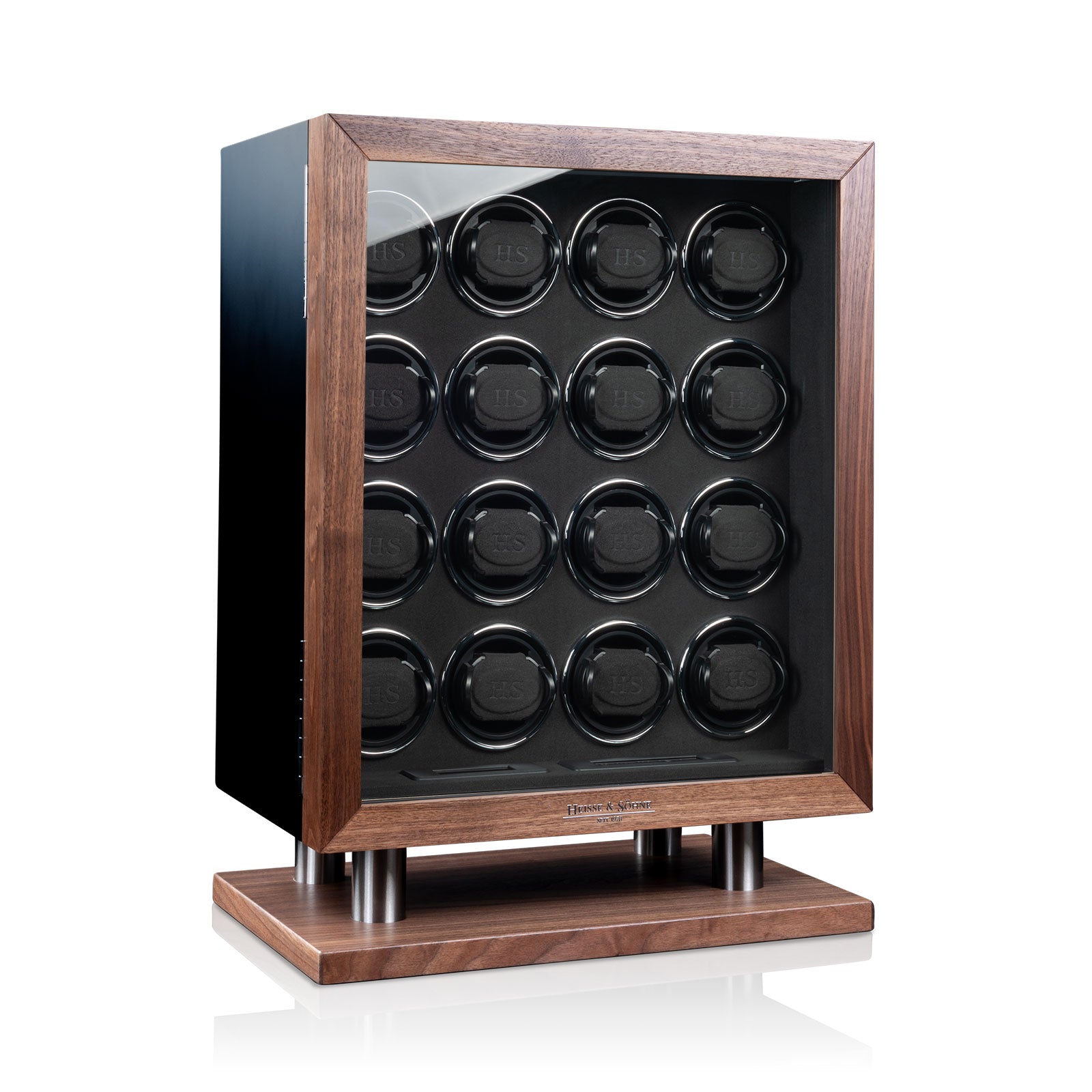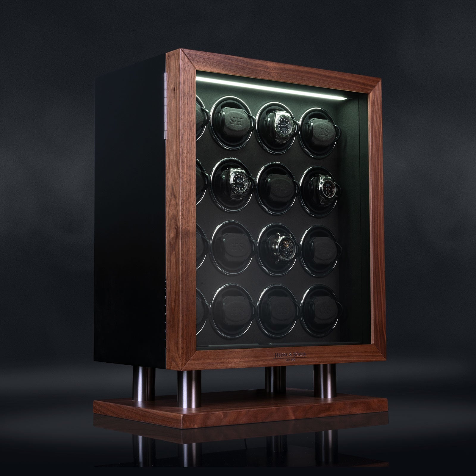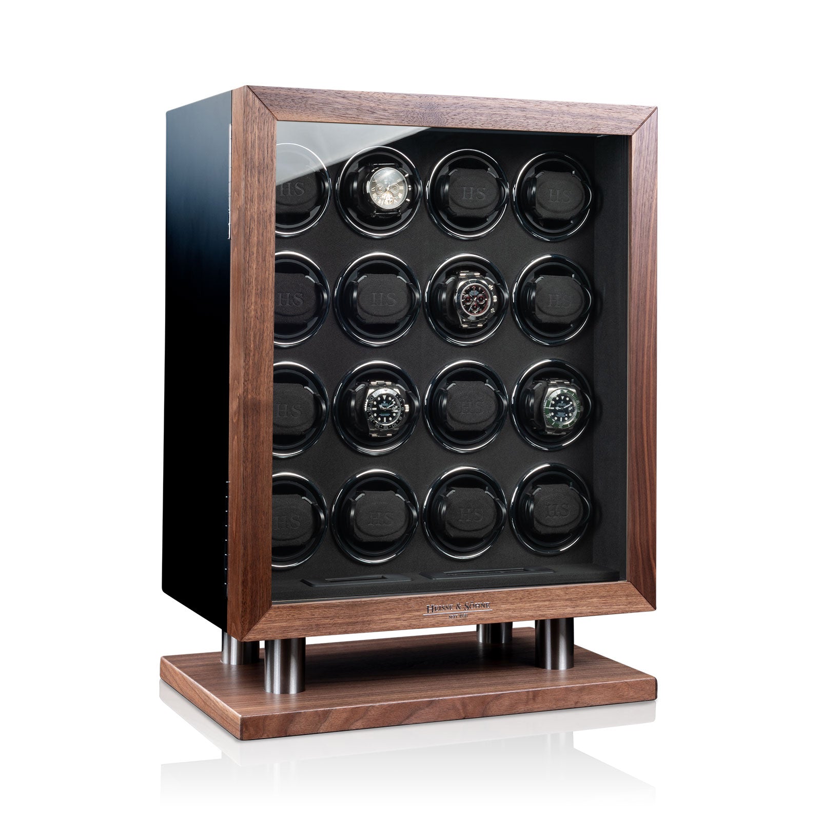 The ever-growing fascination with mechanical timepieces is leading to rapidly growing watch collections. The watch winders of the New York series are predestined for safe and stylish storage. The combination of American walnut and matte lacquer gives this series its simple elegance. The brushed and anodized aluminum applications in the base are highly expressive features of this series. The separately switchable interior lighting sets your watches perfectly in scene at any time of day or night. A lock protects the watches in the watch winder from unauthorized access.