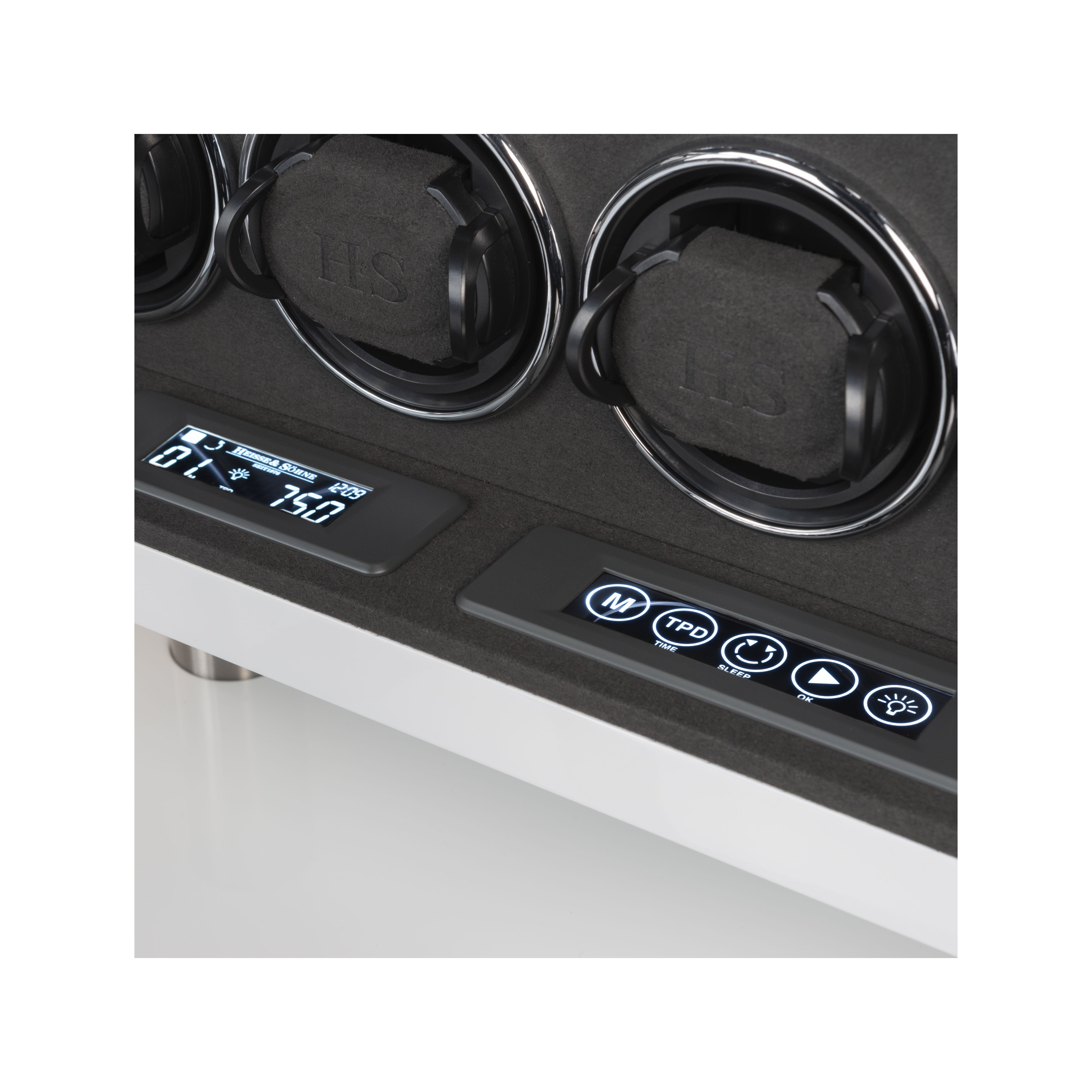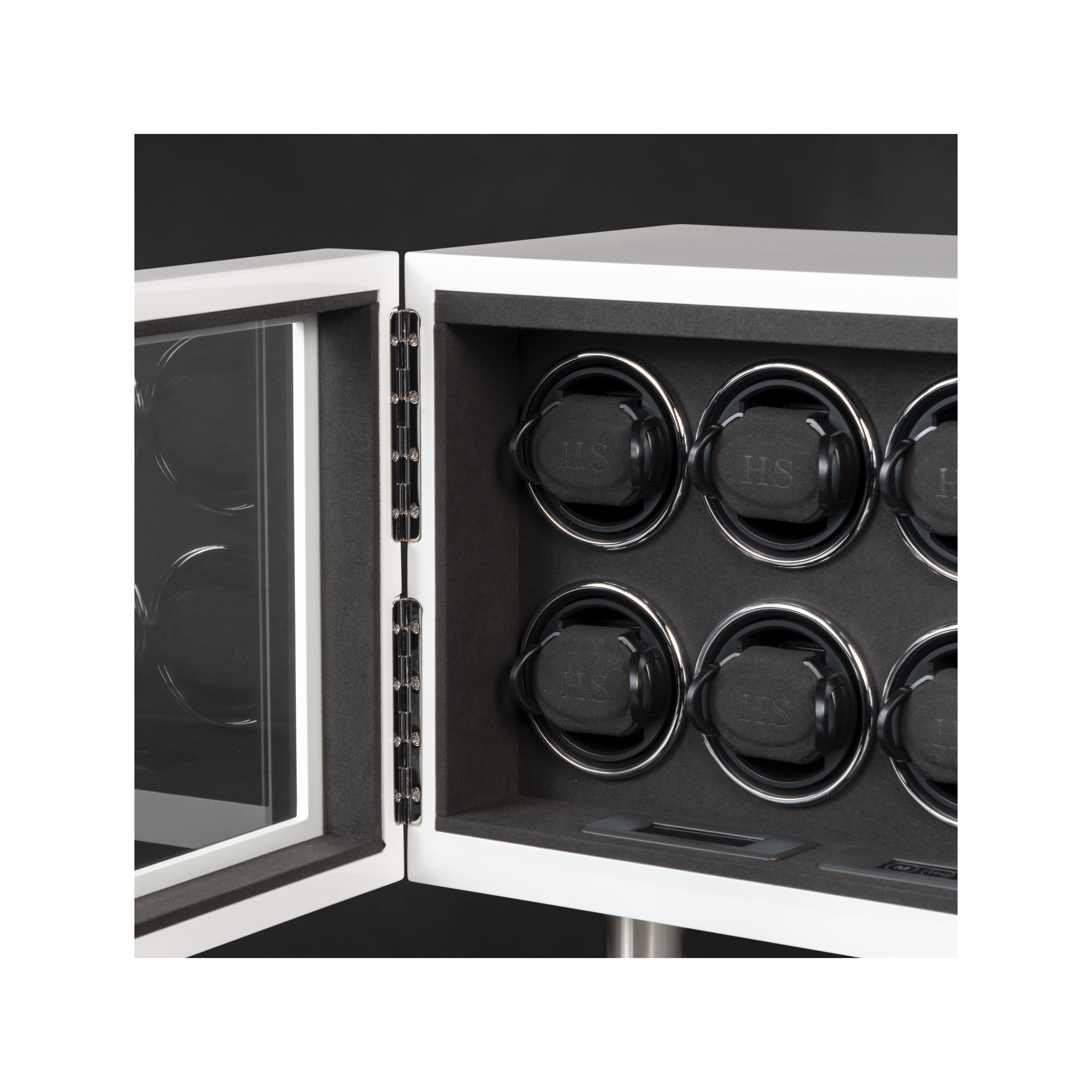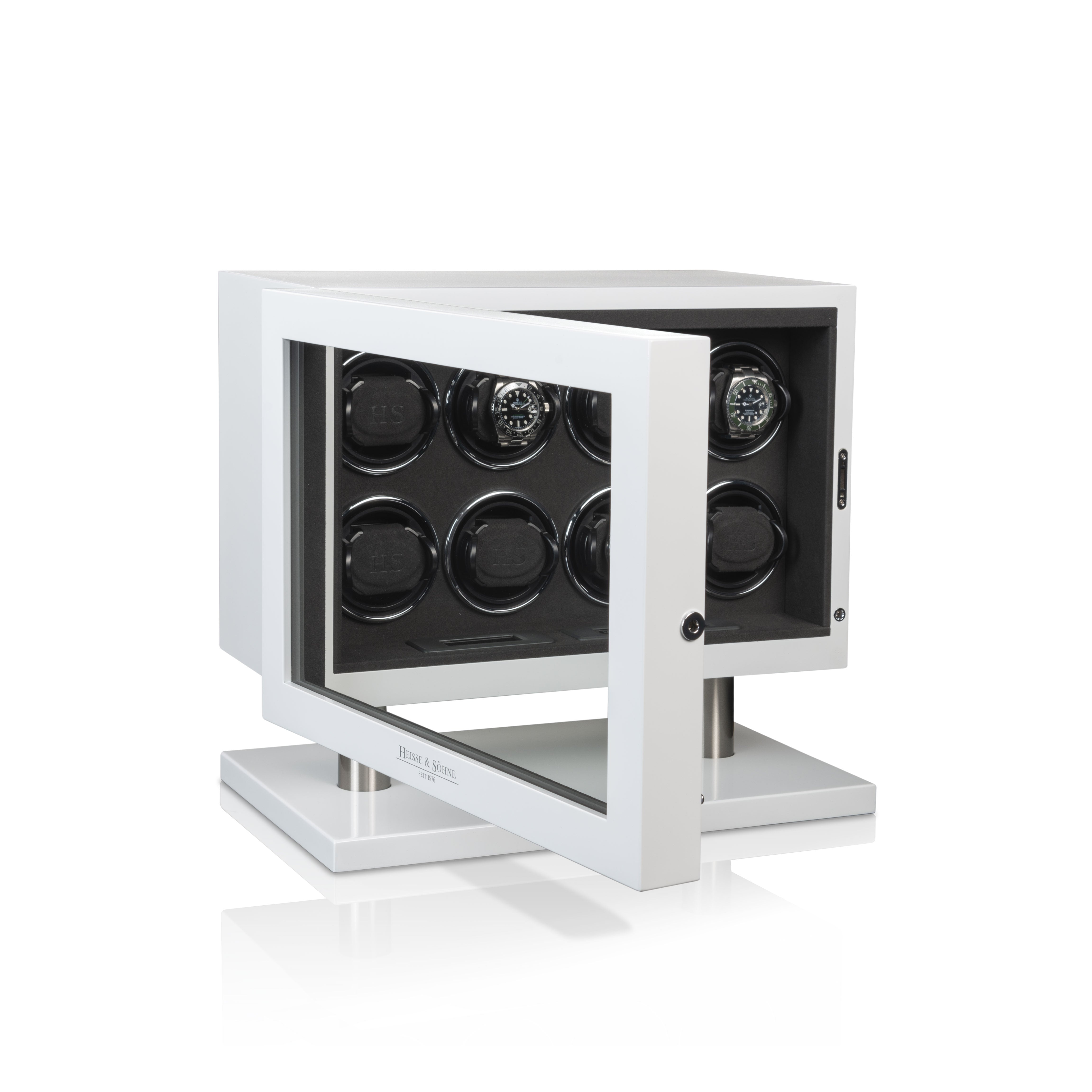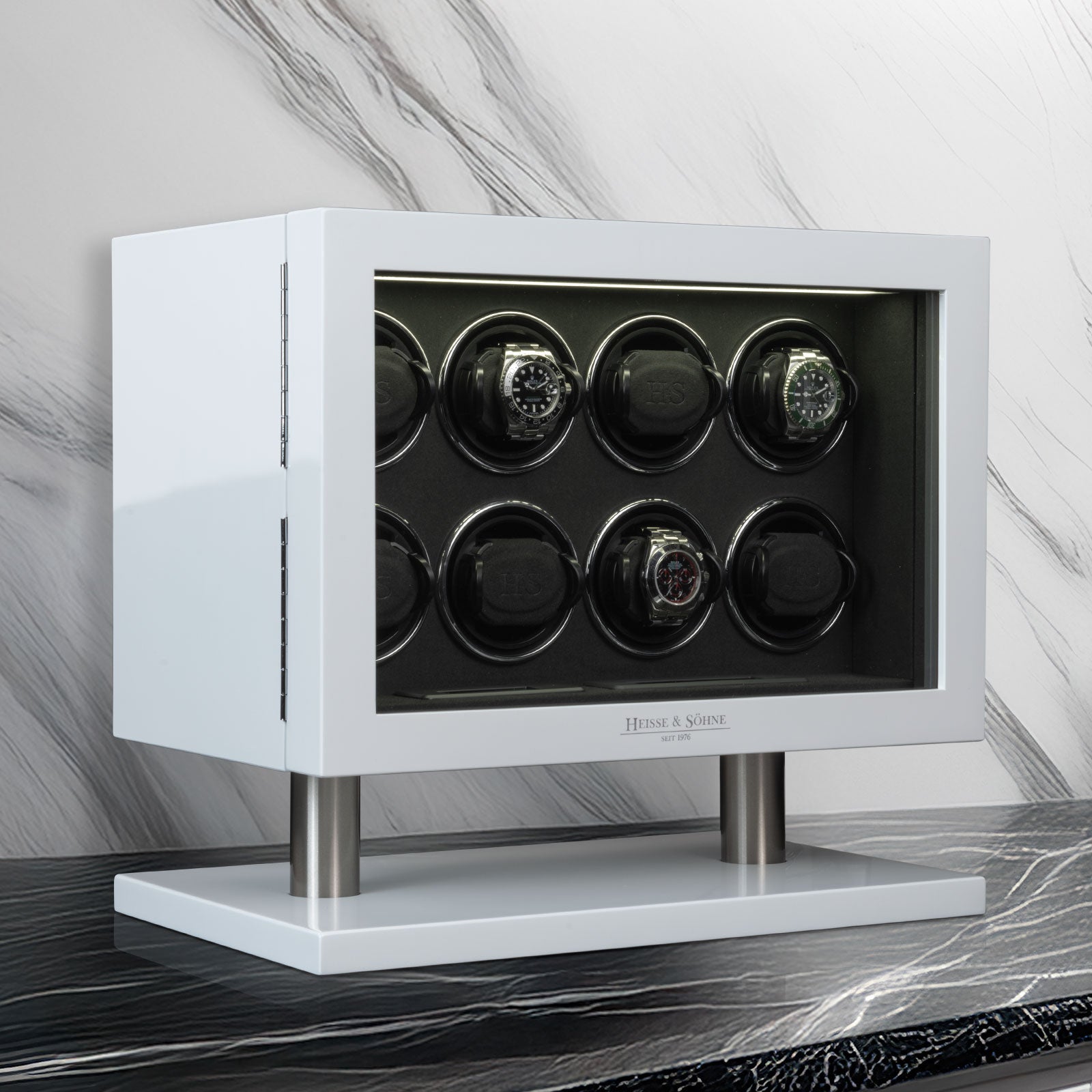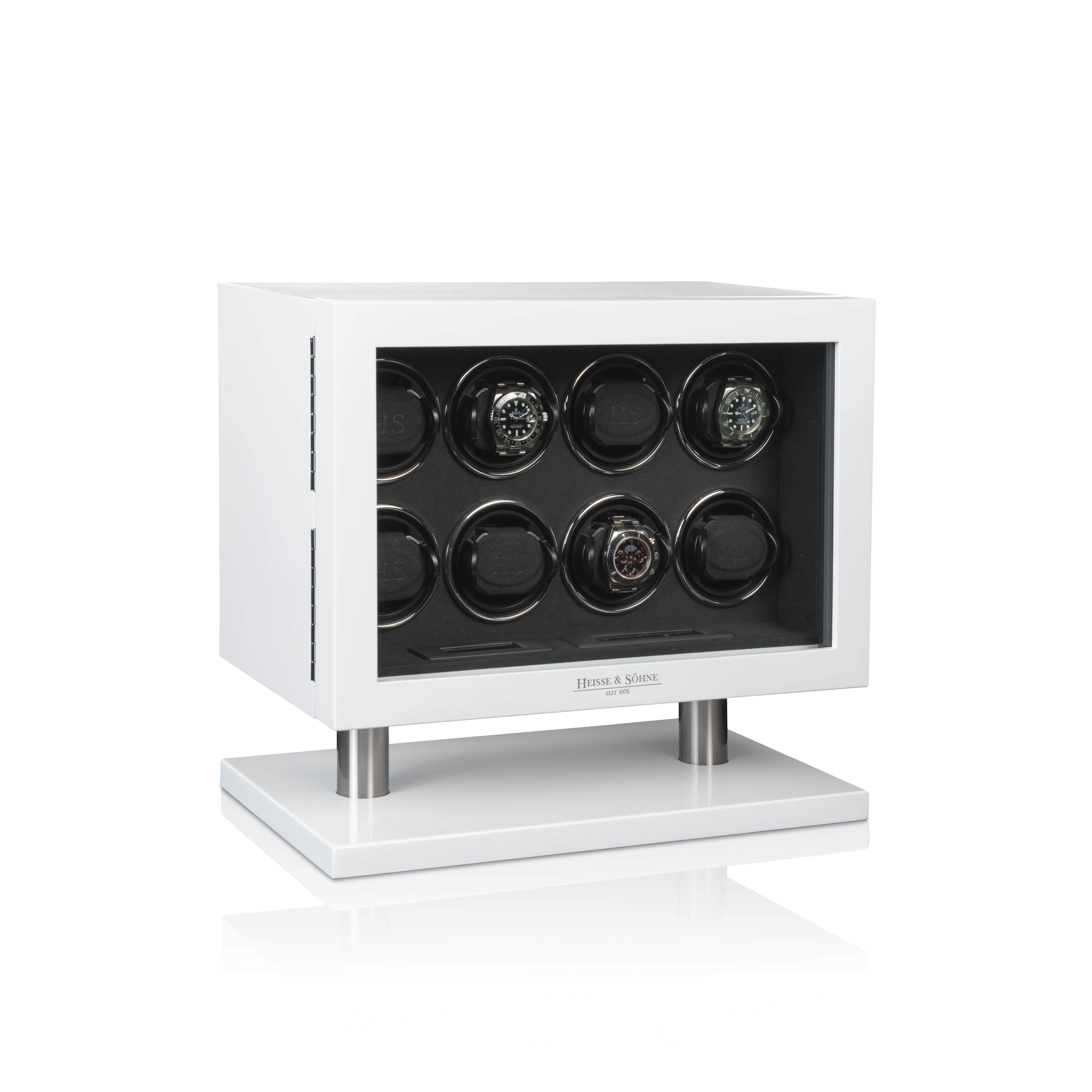 As your collection of fine automatic watches grows, the need for care, security and comfort in watch storage will grow as well. Whether as a stylish addition on a sideboard or an elegant eye-catcher on a pedestal, the collectors of the brand Heisse & Söhne cut a fine figure everywhere. The brushed and anodized aluminum applications in the base are highly expressive features of this series. The separately switchable interior lighting sets your watches perfectly in scene at any time of day or night. A lock protects the watches in the watch winder from unauthorized access.