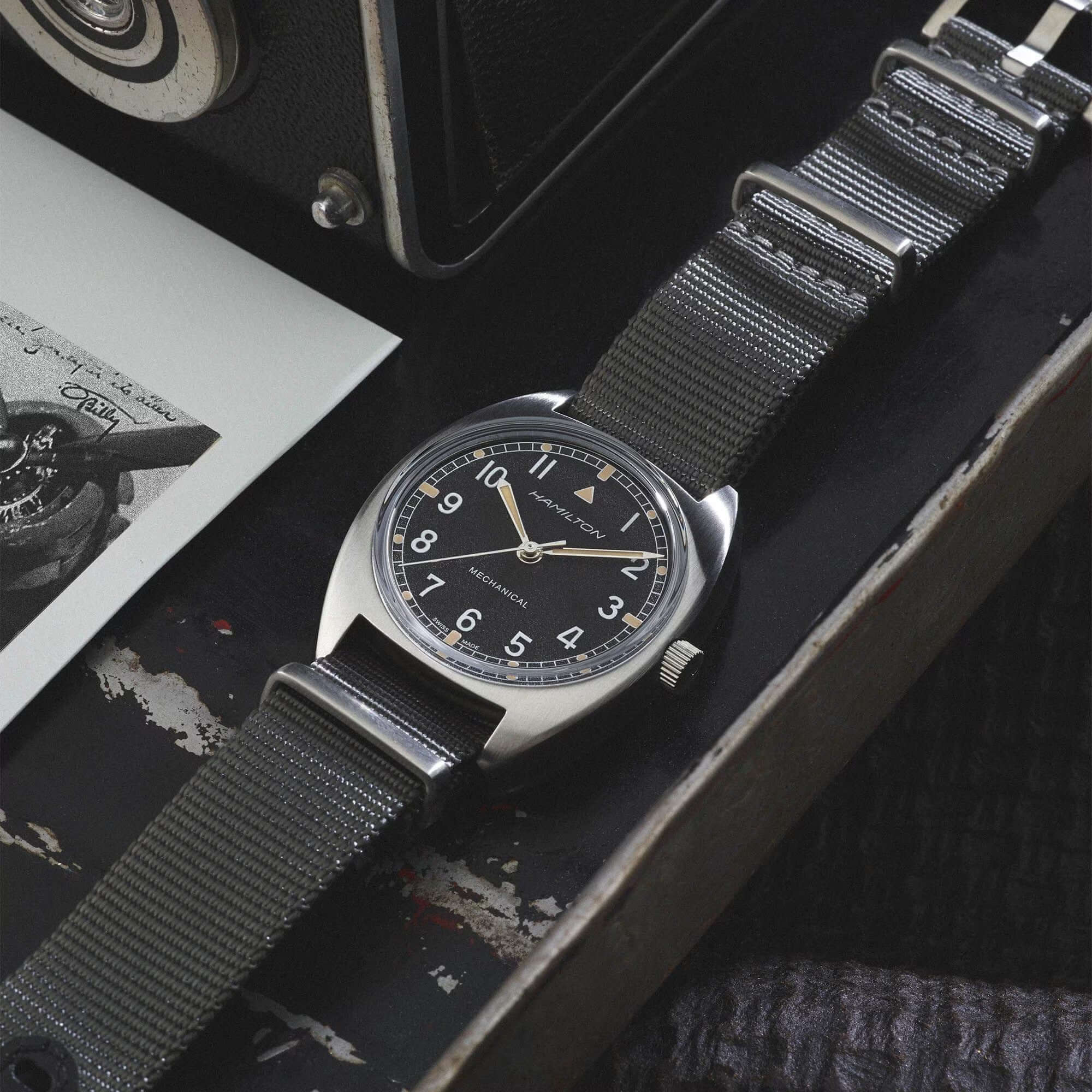 Powered by the awesome H-50 handwinding movement with 80 hours of power reserve, the Khaki Pilot Pioneer is a reinterpretation of a vintage military watch produced for the British Royal Air Force in 1973. Featuring a distinctive dial pattern and robust NATO strap, this is a military watch with real character.