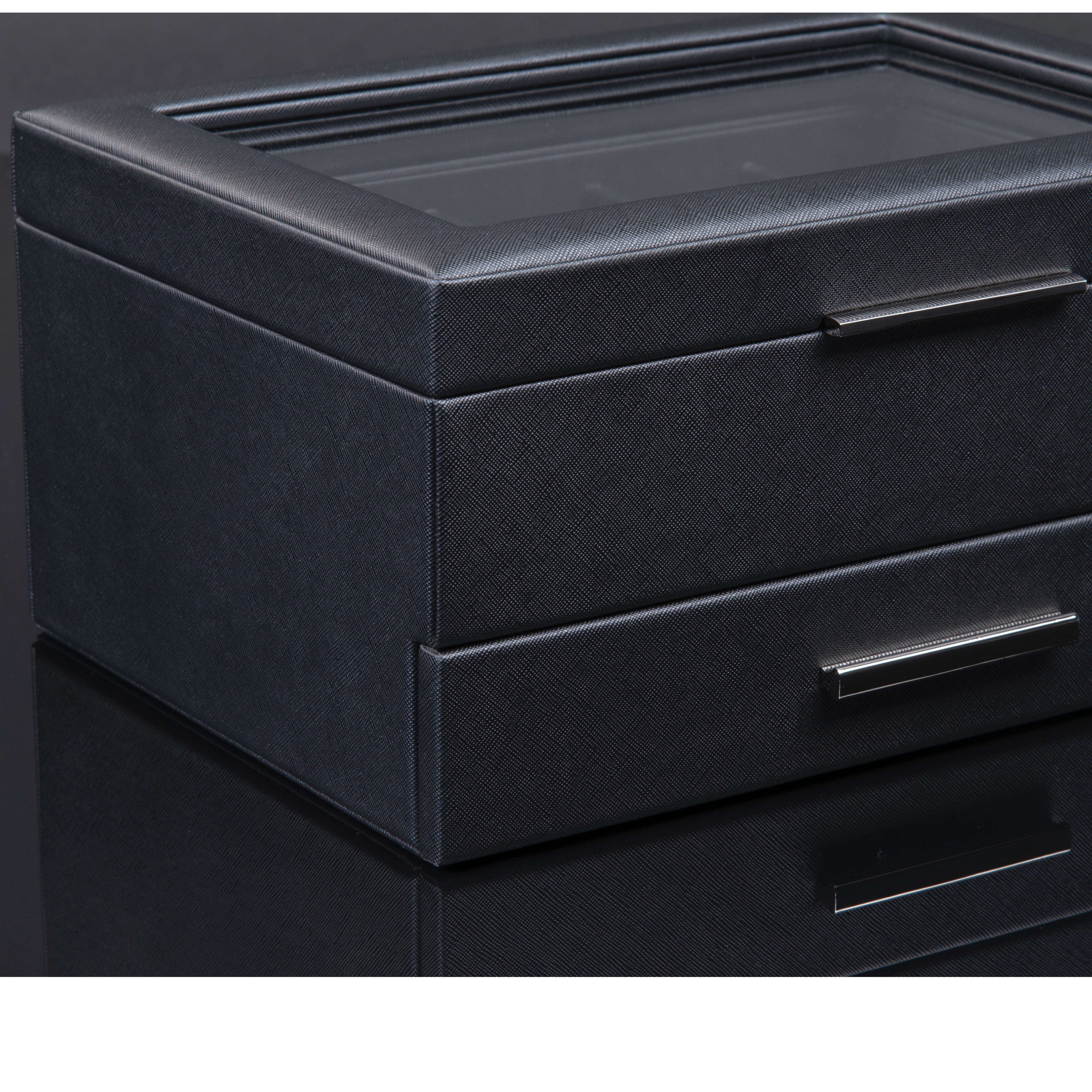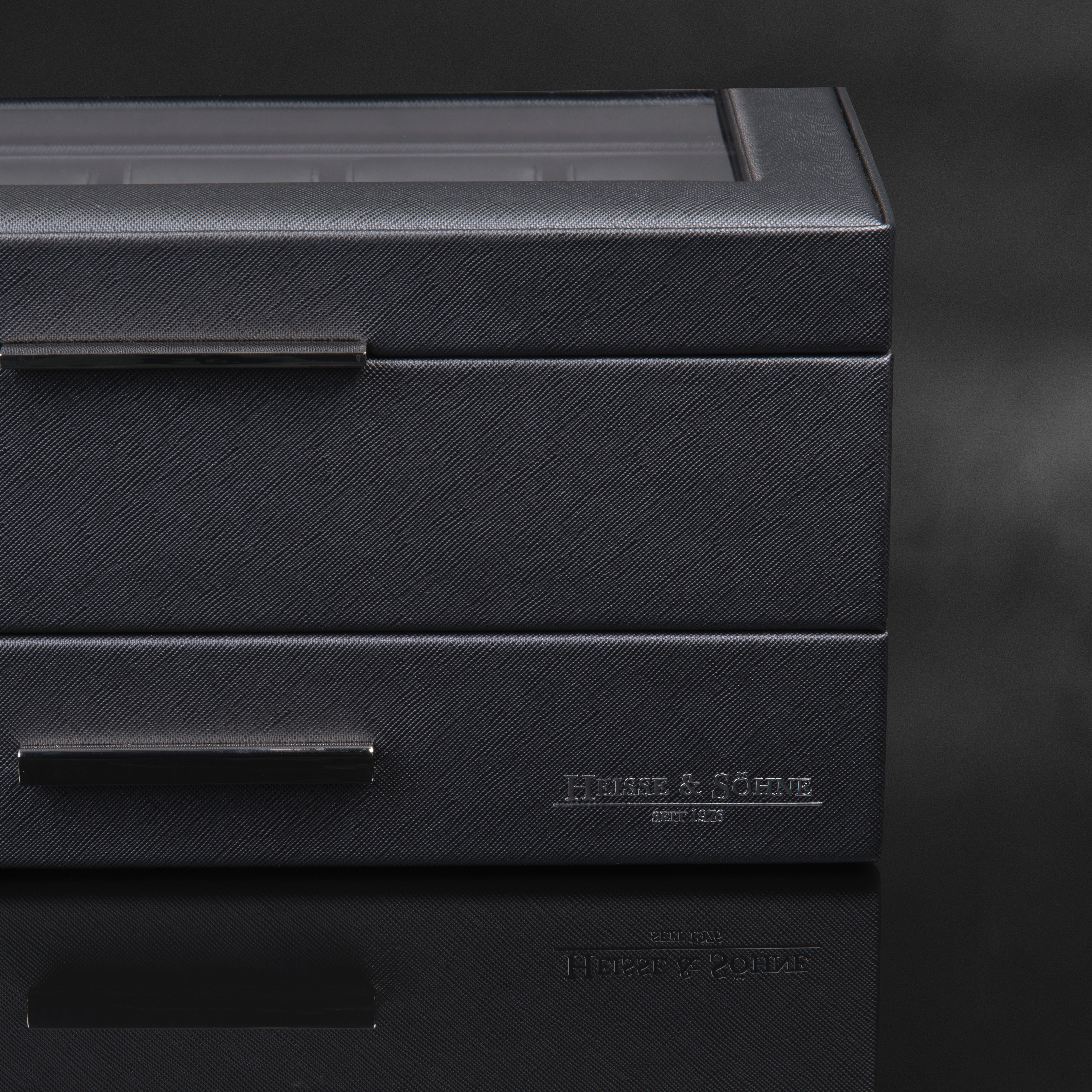 The Heron jewelry and watch box is a particularly elegant and convenient box for storing jewelry and watches. The case of the watch box is covered in high-quality, robust imitation leather with a Saffiano look. Up to 10 watches can be stored in the upper section of the storage box. The interior is lined with soft, high-quality imitation leather to keep watches and accessories safe and stylish.