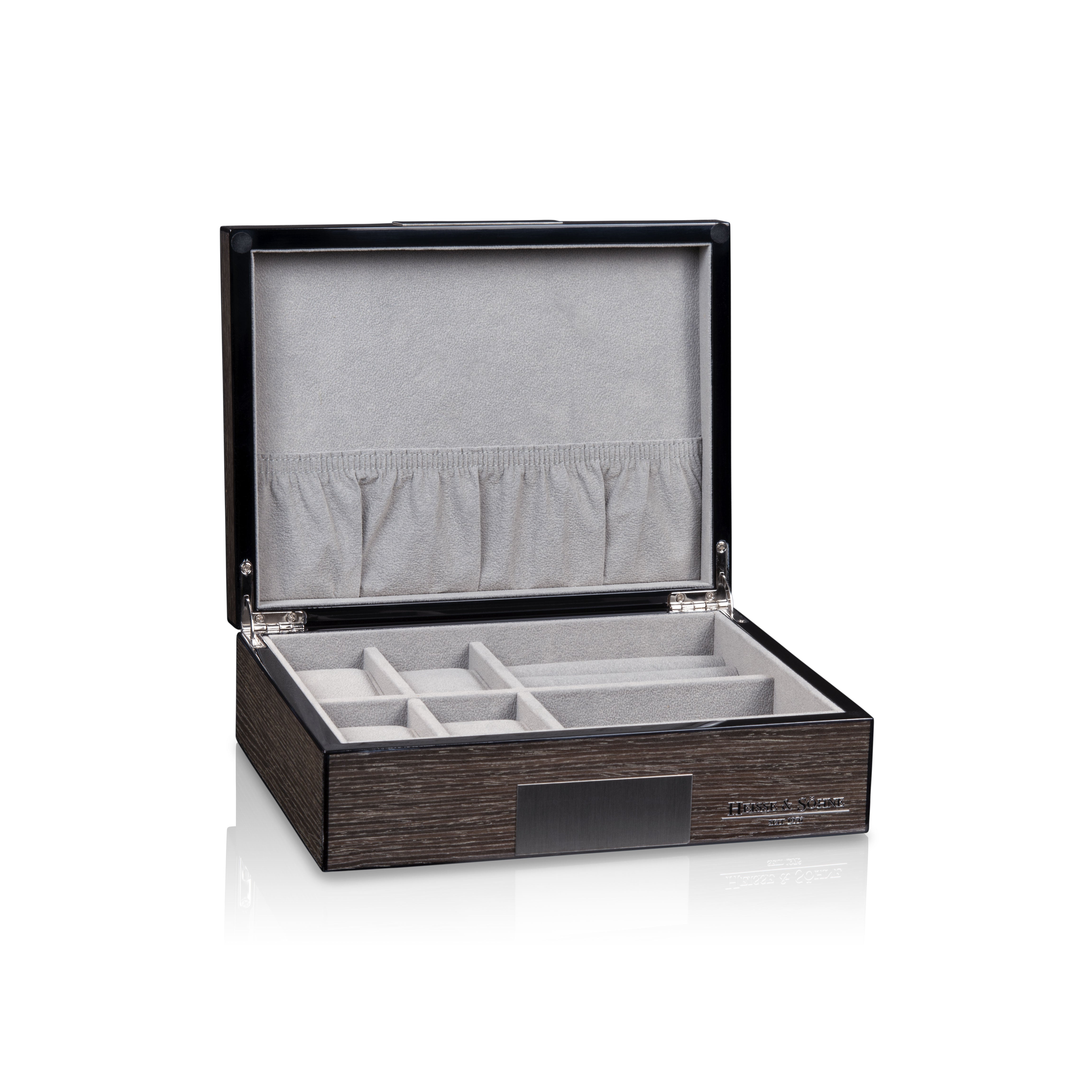 The Leo watch and jewelry box combines timeless elegance and maximum functionality in an exquisite design. The dark Ginko veneer gives the box a luxurious, natural look, while the light gray interior creates a fascinating contrast and stylishly rounds off the design.
