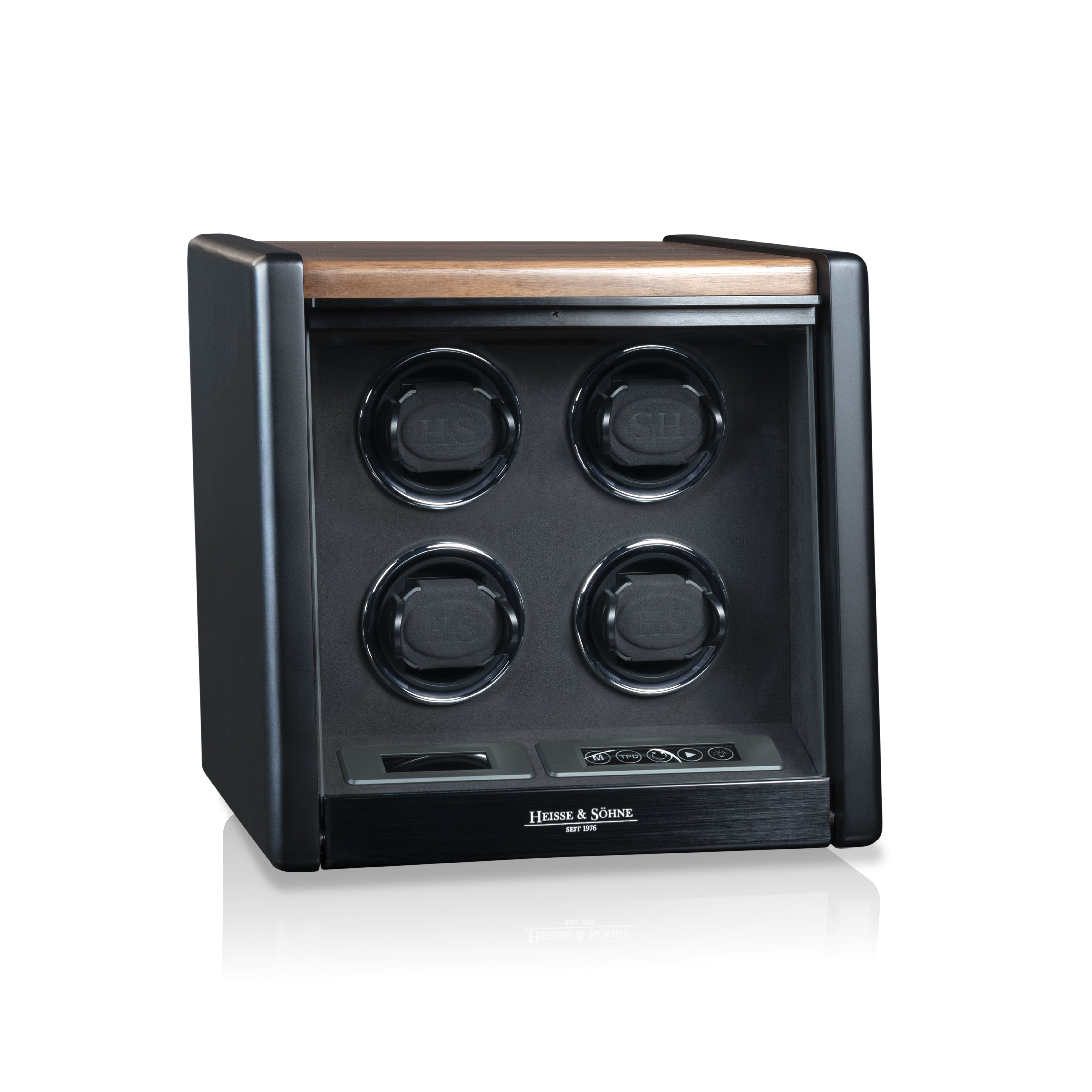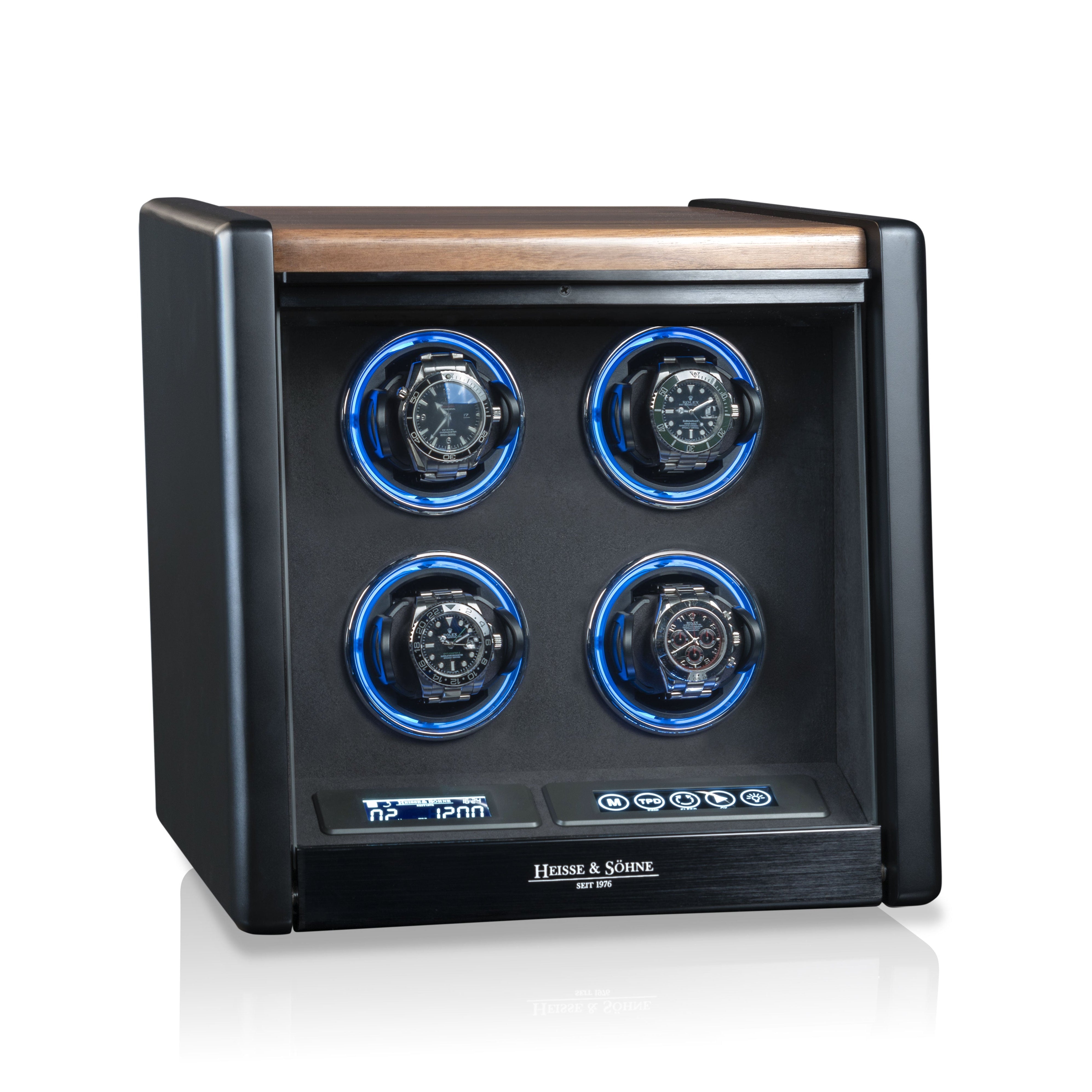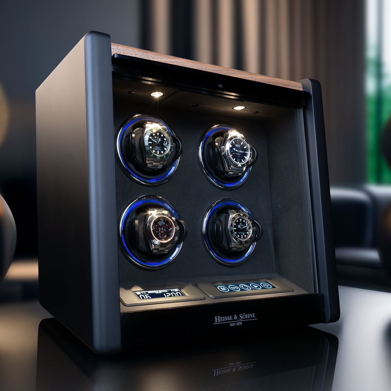 The Madrid series boasts a striking trapezoidal shape, artfully crafted from fine woods and framed by satin accents. One highlight is the H&S Motion-Light, which offers selectable colors to bathe the watches in a fascinating light. The combination of design and lighting showcases the watches in an impressive way.