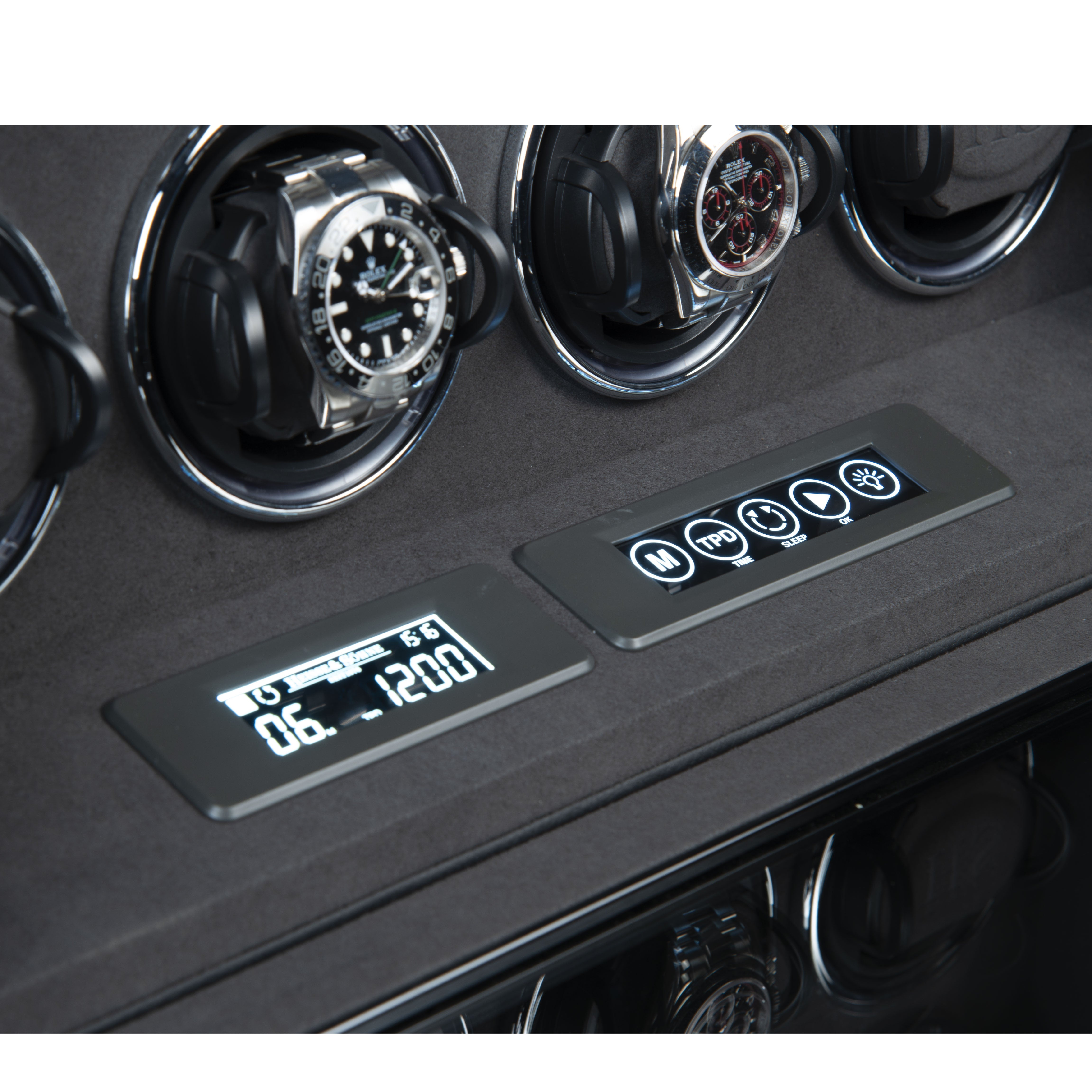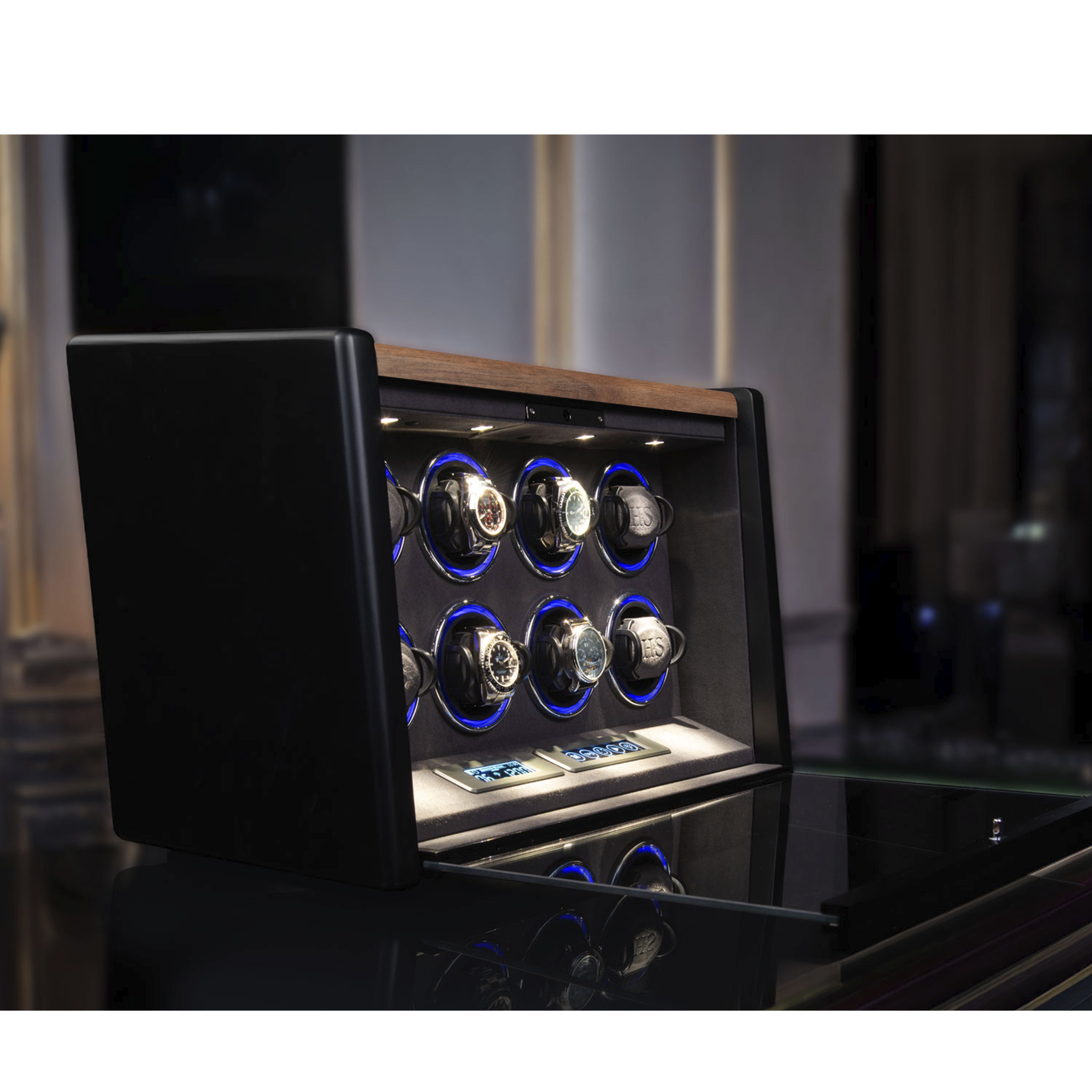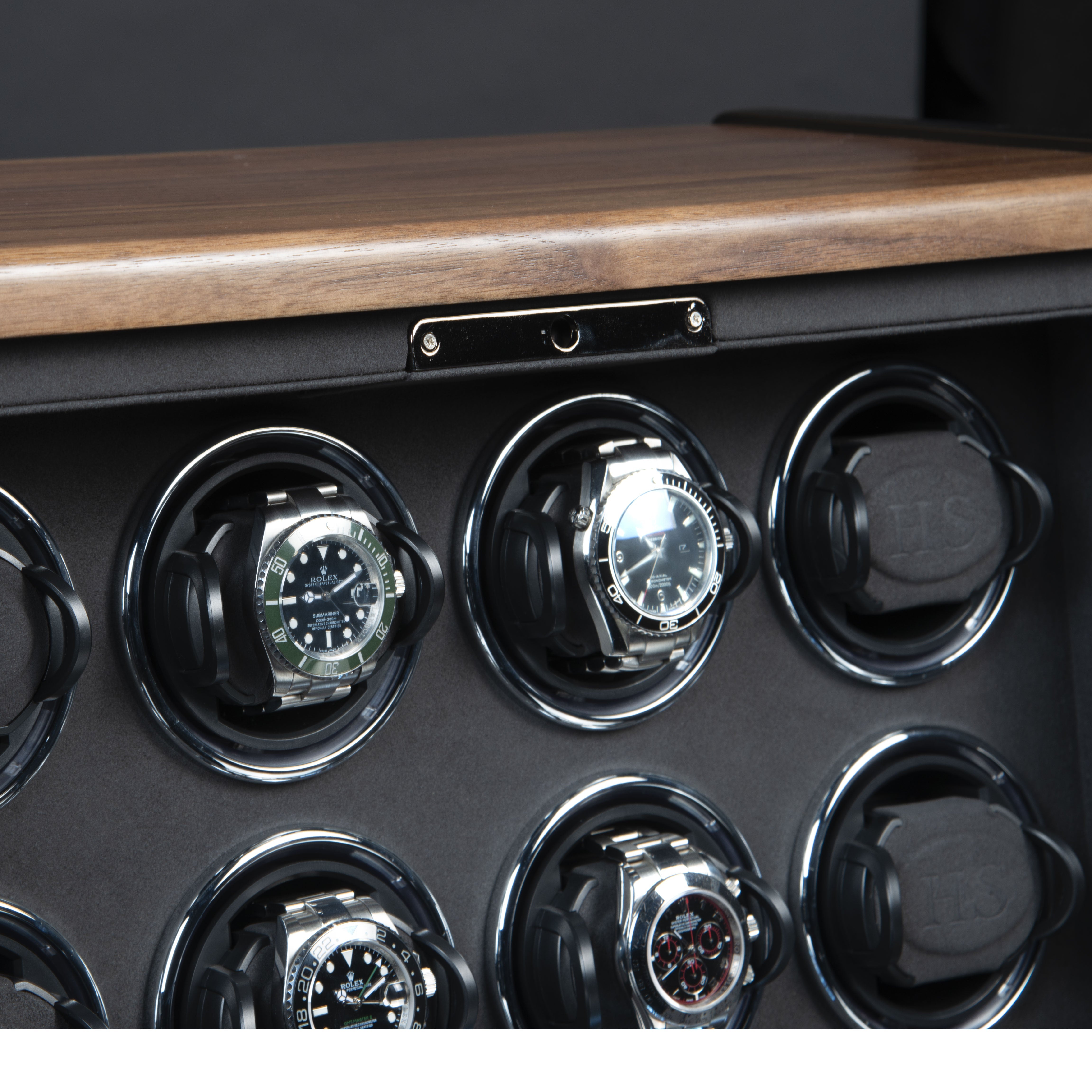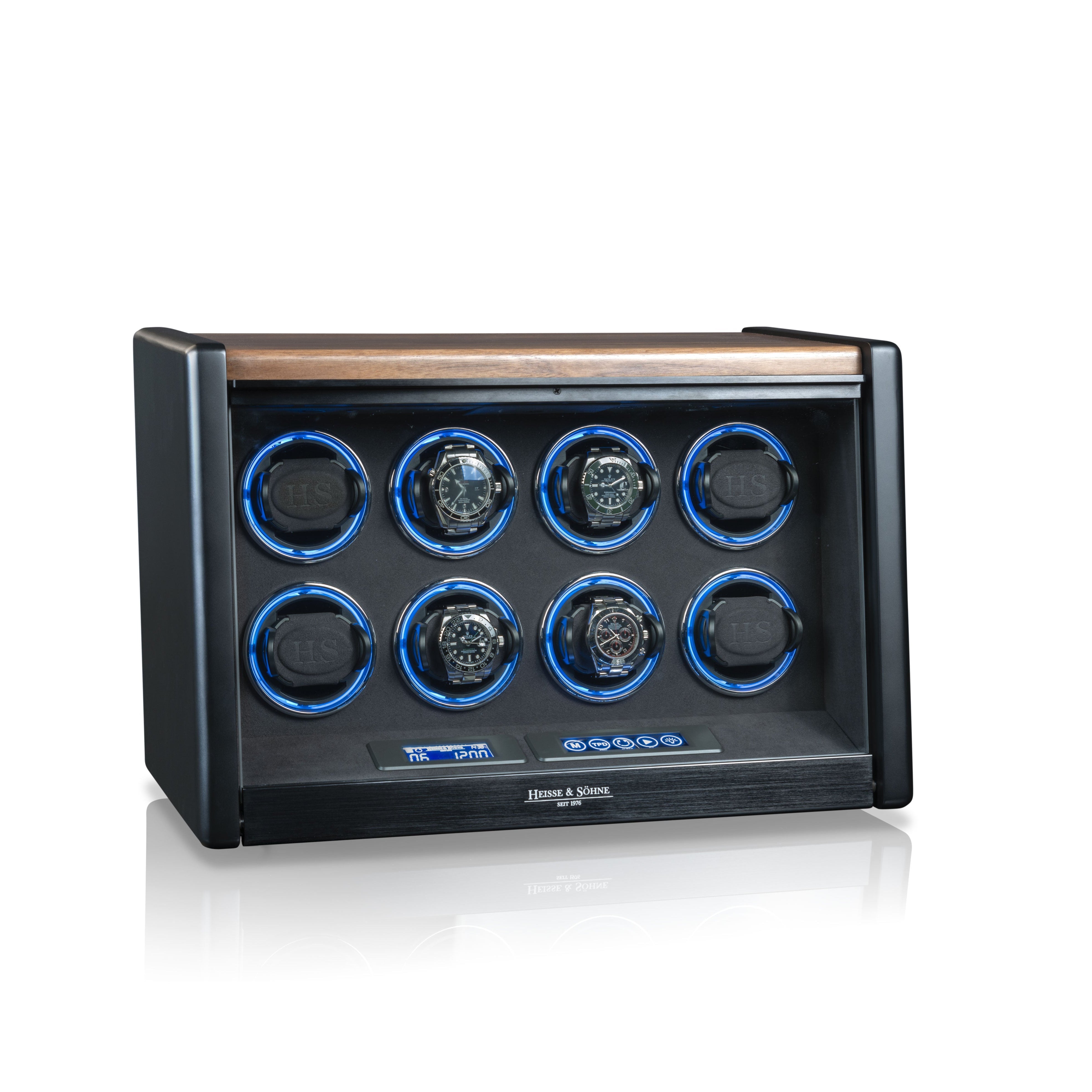 The Madrid series boasts a striking trapezoidal shape, artfully crafted from fine woods and framed by satin accents. One highlight is the H&S Motion-Light, which offers selectable colors to bathe the watches in a fascinating light. The combination of design and lighting showcases the watches in an impressive way.