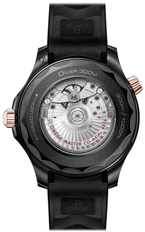 Caliber Omega 8806 master co-axial automatic movement with 55 hours power reserve, and central seconds hand and round index hour markers. Black ceramic dial featuring laser-engraved waves. Black ceramic bezel with a white enamel diving scale, set on a 44mm anti-magnetic Sedna gold & ceramic case. Helium-escape valve at 10 o'clock position. Sapphire crystal on top and an exhibition case-back. Water resistant to 300M. Black rubber strap with a folding deployment clasp.